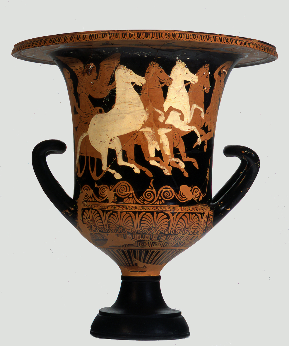 Εικ. 2. Ερυθρόμορφος κρατήρας με Νίκη σε αποβατικό τέθριππο και ένοπλο αναβάτη. Άγνωστης προέλευσης. 360-350 π.Χ. (© ΤΑΠΑ/Εθνικό Αρχαιολογικό Μουσείο, φωτογράφος: K.V. von Eickstedt).