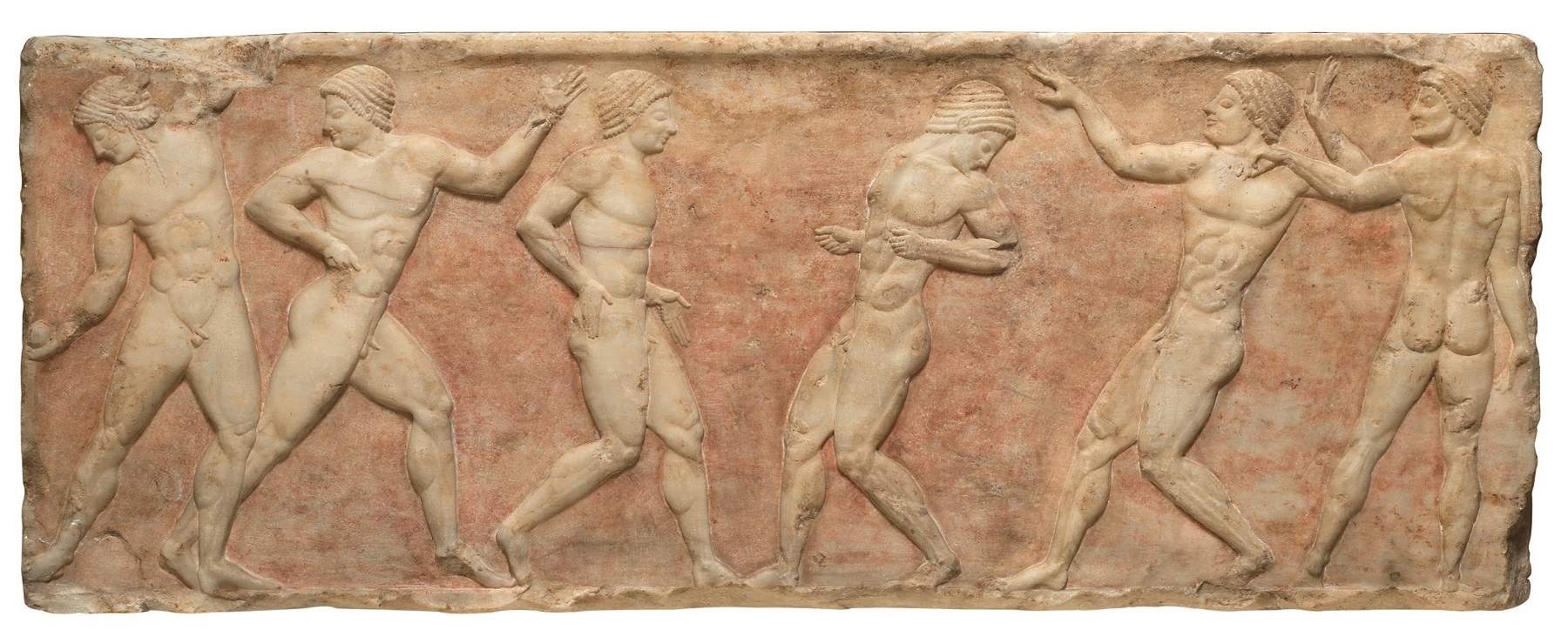 Εικ.1: Μαρμάρινη βάση επιτύμβιου αγάλματος κούρου με ανάγλυφες παραστάσεις. Bρέθηκε στην Αθήνα, δίπλα στο πιλοποιείο του βιομήχανου Ηλ. Πουλόπουλου, εντειχισμένο μέσα στο Θεμιστόκλειο τείχος. O κούρος θα ήταν στημένος στον τάφο αθλητή. 510-500 π.X. (© ΥΠΠΟΑ/ΤΑΠΑ/Εθνικό Αρχαιολογικό Μουσείο, φωτογράφος: Γιάννης Πατρικιάνος).