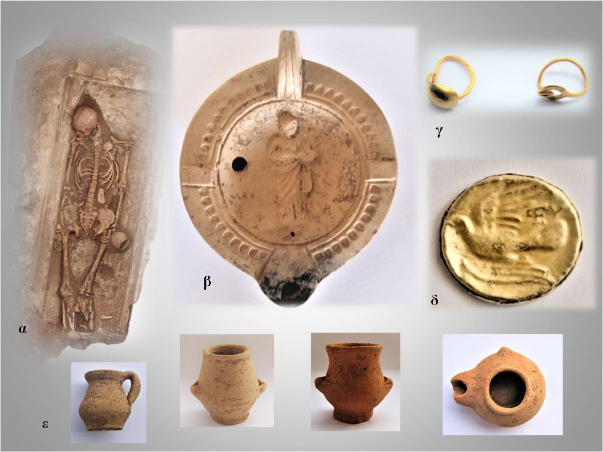 Στο χώρο του νεκροταφείου πραγματοποιήθηκαν τομές περιμετρικά του δίχωρου υπέργειου ρωμαϊκού ταφικού μνημείου και της υποκείμενης αυτού δεξαμενής ελληνιστικών χρόνων, που ανασκάφηκαν το 2016 και 2017. Φέτος εντοπίστηκαν επτά νέοι τάφοι. Τέσσερις από αυτούς χρονολογούνται στους ρωμαϊκούς χρόνους και βρίσκονται βόρεια του ταφικού μνημείου, εντός των ρωμαϊκών ταφικών περιβόλων. Σε χαμηλότερο επίπεδο διερευνήθηκαν τρείς τάφοι ελληνιστικών χρόνων, εκ των οποίων ο ένας επαναχρησιμοποιήθηκε κατά τους ρωμαϊκούς χρόνους. Από τα οστεολογικά κατάλοιπα των εννέα ταφών οι δύο σκελετοί ανήκαν σε ενήλικους άνδρες, οι πέντε σε ενήλικες γυναίκες και οι δύο σε παιδιά. Μάλιστα, σε έναν από τους τάφους εντοπίσθηκε γυναικεία μαζί με παιδική ταφή.