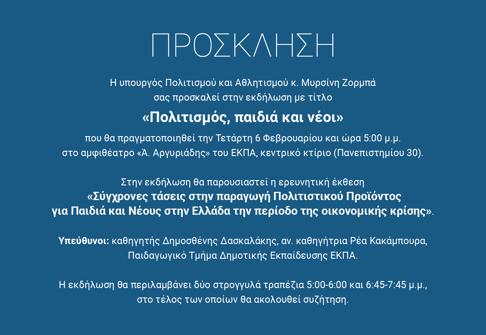 Το Υπουργείο Πολιτισμού και Αθλητισμού διοργανώνει εκδήλωση με τίτλο «Πολιτισμός, παιδιά και νέοι», με αφορμή την ολοκλήρωση της έρευνας «Σύγχρονες τάσεις στην παραγωγή Πολιτιστικού Προϊόντος για Παιδιά και Νέους στην Ελλάδα την περίοδο της οικονομικής κρίσης» του Παιδαγωγικού Τμήματος του ΕΚΠΑ. Η εκδήλωση θα πραγματοποιηθεί την Τετάρτη 6 Φεβρουαρίου 2019 στις 5 μ.μ. στο Αμφιθέατρο «Άλκης Αργυριάδης» του Πανεπιστημίου Αθηνών (κεντρικό κτίριο, Πανεπιστημίου 30) με παρουσίαση και συζήτηση της ερευνητικής έκθεσης σε δύο στρογγυλά τραπέζια.