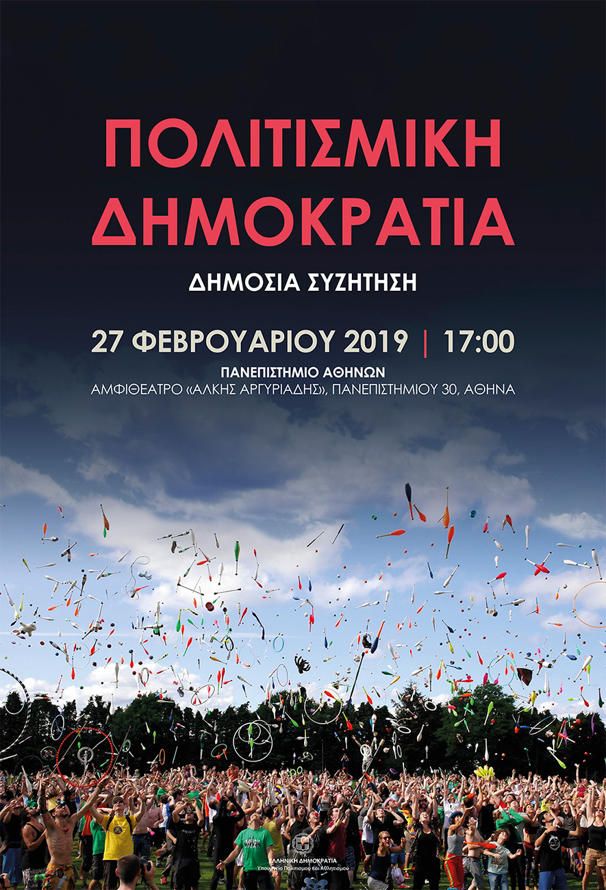 Δημόσια συζήτηση, με θέμα «Πολιτισμική Δημοκρατία» διοργανώνει το Υπουργείο Πολιτισμού και Αθλητισμού, την Τετάρτη 27 Φεβρουαρίου στις 17:00, στο κεντρικό κτίριο του Εθνικού Καποδιστριακού Πανεπιστημίου (αμφιθέατρο Άλκης Αργυριάδης).
