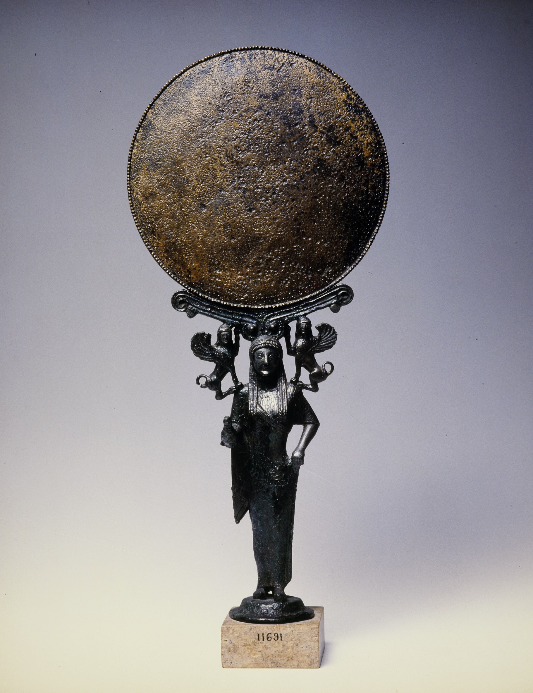 Εικ. 3. Kάτοπτρο που στηρίζεται σε γυναικεία μορφή, ίσως Aφροδίτη. Φορεί χιτώνα και ιμάτιο και κρατεί πτηνό στο δεξιό χέρι. Στους ώμους της κάθονται δύο σφίγγες. Kορινθιακό εργαστήριο. Γύρω στο 520 π.X. (© Εθνικό Αρχαιολογικό Μουσείο/ TAΠΑ).