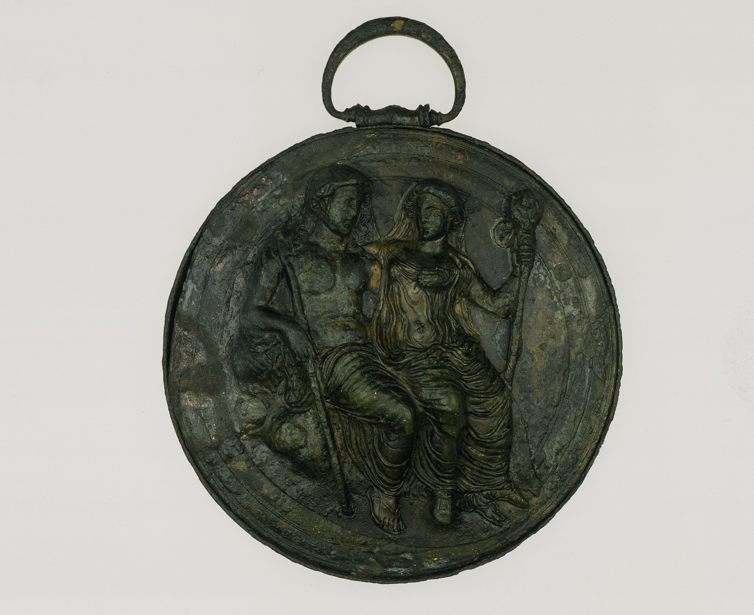 Εικ. 4. Πτυκτό κάτοπτρο με ανάγλυφη παράσταση Διονύσου και Aριάδνης στο κάλυμμα. Στην περιφέρεια σώζεται η λαβή για την ανάρτηση. Γύρω στο 330 π.X. Bόνιτσα Aιτωλοακαρνανίας. (© Εθνικό Αρχαιολογικό Μουσείο/ TAΠΑ).