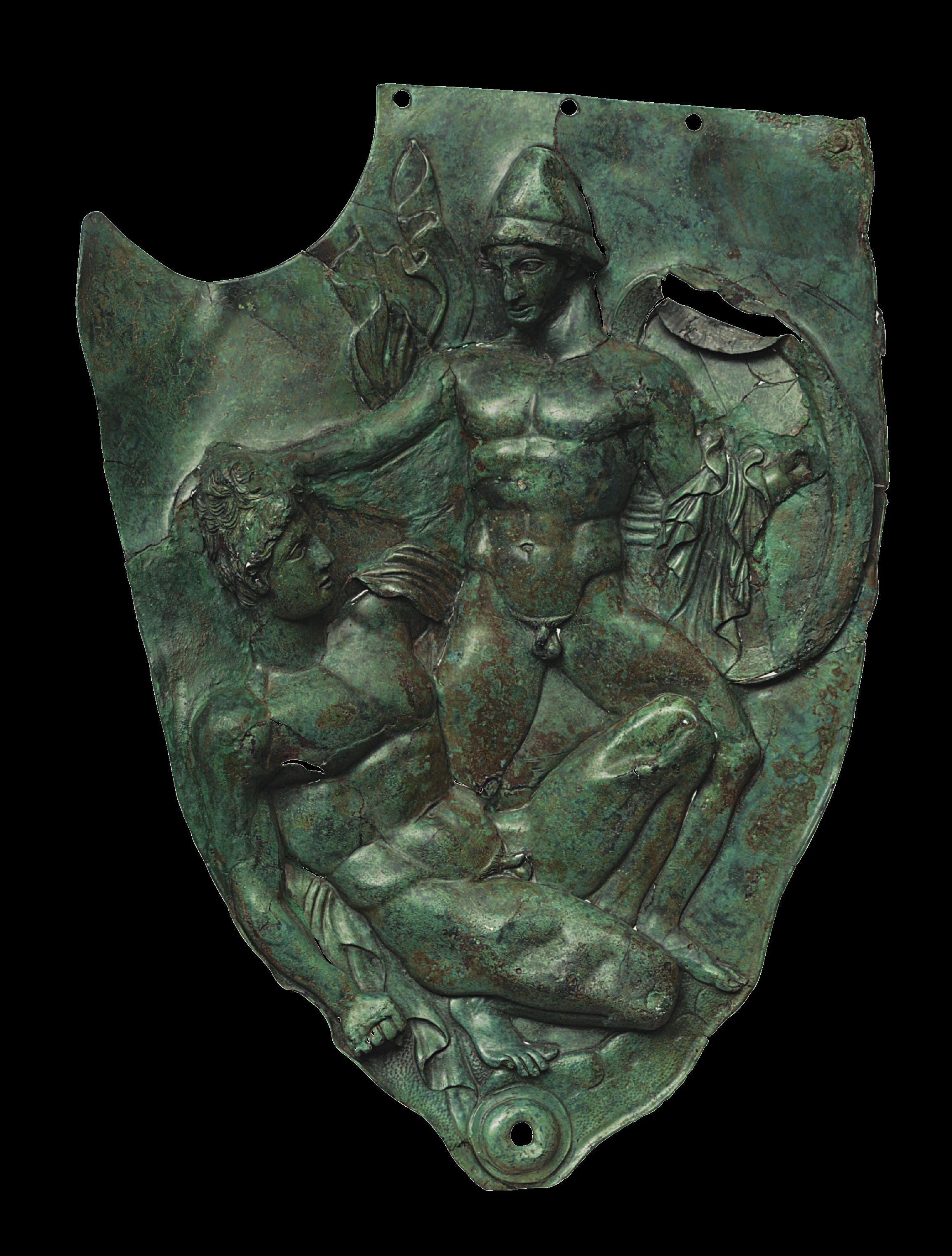 Εικ. 1. Εικόνες πολέμου. Εθνικό Αρχαιολογικό Μουσείο, αρ. ευρ. Καρ 166. Χάλκινη παραγναθίδα κράνους με ανάγλυφη σκηνή μάχης. Από τη Δωδώνη. Τέλη 5ου-αρχές 4ου αι. π.Χ. (© Εθνικό Αρχαιολογικό Μουσείο/ TAΠΑ).