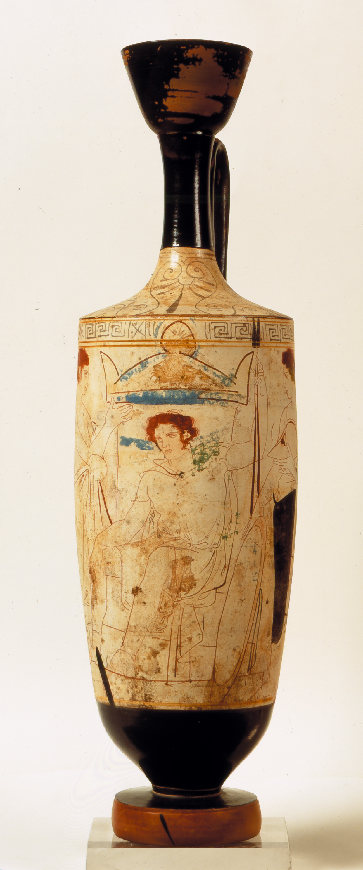 Εικ. 2. Λευκή λήκυθος. Νέος πολεμιστής κάθεται στα σκαλιά του τάφου του. Πλάι του γυναίκα που κρατά το κράνος και την ασπίδα του και νέος άνδρας. Από την Ερέτρια. Της Ομάδας R. 410-400 π.Χ. (© Εθνικό Αρχαιολογικό Μουσείο/ TAΠΑ).