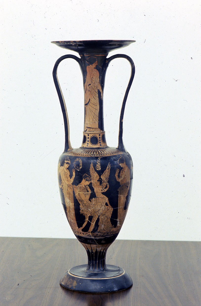 Εικ. 3. Ερυθρόμορφη λουτροφόρος. Λουτροφορία (η μεταφορά του νερού για το λουτρό της νύφης). Προηγείται ο αυλητής και γυναίκα με δάδες. Την κόρη με τη λουτροφόρο ακολουθεί η νύφη. Άγνωστη προέλευση. Του Ζωγράφου του Λουτρού. 430-425 π.Χ. (© Εθνικό Αρχαιολογικό Μουσείο/ TAΠΑ).