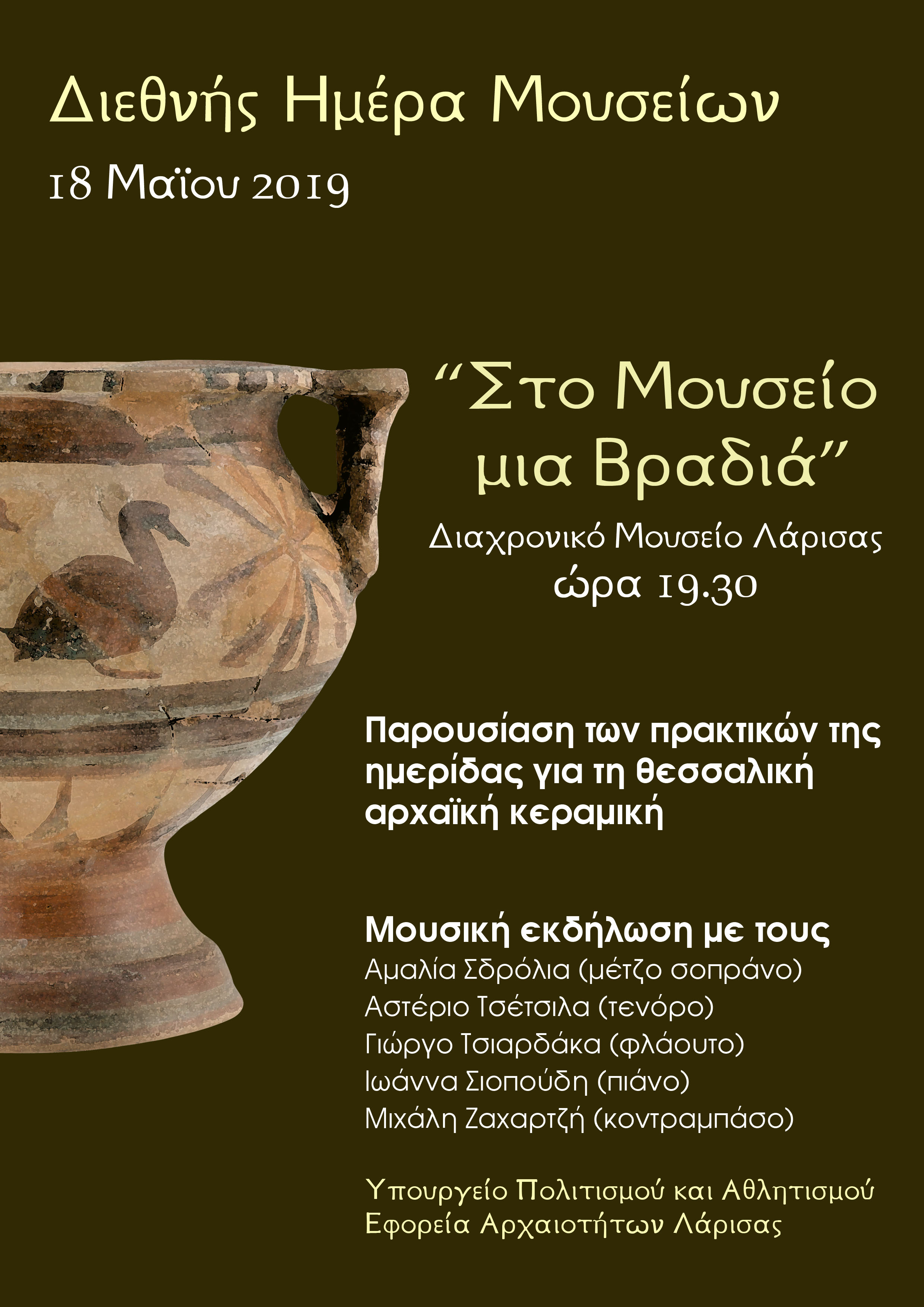 Ο Υφυπουργός Πολιτισμού Κώστας Στρατής για τον εορτασμό της Διεθνούς Ημέρας Μουσείων, το Σάββατο 18 Μαΐου στις 19.30μμ, θα παραβρεθεί στις εκδηλώσεις που διοργανώνει το Διαχρονικό Μουσείο Λάρισας, με τίτλο “Στο Μουσείο μια βραδιά”.