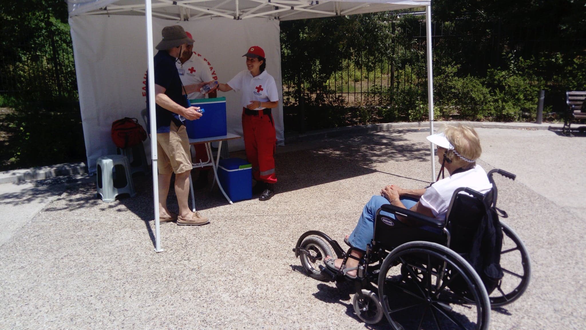 Τρίτη, Πέμπτη και Σαββατοκύριακα, οπότε και η μεγαλύτερη επισκεψιμότητα της Ακρόπολης, στη Δ. Αρεοπαγίτου ποδηλάτες με εξοπλισμό του Ελληνικού Ερυθρού Σταυρού προσφέρουν εμφιαλωμένο νερό στους επισκέπτες.