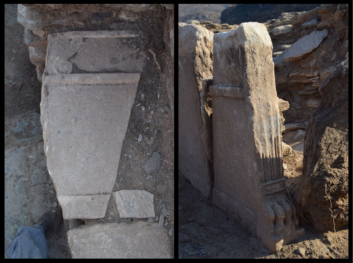 Στο νότιο ανώτερο πλάτωμα της νησίδας αποκαλύφθηκε μνημειώδες ανάλημμα, μήκους σχεδόν 22 μέτρων, που προσωρινά μπορεί να χρονολογηθεί στους κλασικούς χρόνους, τόσο από την ισόδομη τοιχοποιία του, όσο και από την κεραμεική που συλλέχθηκε εντός του στρώματος «λατύπης» που συνδέεται με την κατασκευή του (εικ. 3). Τα ευρήματα είναι εξαιρετικής ποιότητας κεραμεική των Γεωμετρικών και αρχαϊκών χρόνων, καθώς και ορισμένα ευρήματα αναμφίβολα αναθηματικού χαρακτήρα (μικρογραφικά αγγεία, πήλινα γυναικεία ειδώλια, κ.ά.) (εικ. 4-6). Σε απόσταση 5 μέτρων ανατολικά του αναλήμματος, ο λαξευμένος βράχος σχηματίζει ορθογώνιο έξαρμα διαστάσεων 11x4 μ. περίπου, εξαιρετικά διαβρωμένο σήμερα, το οποίο φαίνεται ότι ταυτίζεται με μνημειώδη βωμό (σε πρώτο πλάνο στην εικ. 3). Το ανάλημμα σχηματίζει ένα είδος κρηπίδας ύψους 4,50 μ., δυτικά του οποίου ο φυσικός βράχος σχηματίζει ένα ευρύχωρο άνδηρο με πολυάριθμα ίχνη από αρχαία λαξεύματα, ορισμένα από τα οποία φαίνεται ότι σχετίζονται με κάποιο μνημειώδη ναό που προφανώς είχε ιδρυθεί εδώ. Η προσεκτική μελέτη των λαξευμάτων αυτών ίσως επιτρέψει να αποσαφηνιστεί ως έναν βαθμό η μορφή του κλασικού-ελληνιστικού ναού. Η ταυτότητα της λατρευόμενης θεότητας παραμένει άγνωστη προς το παρόν.