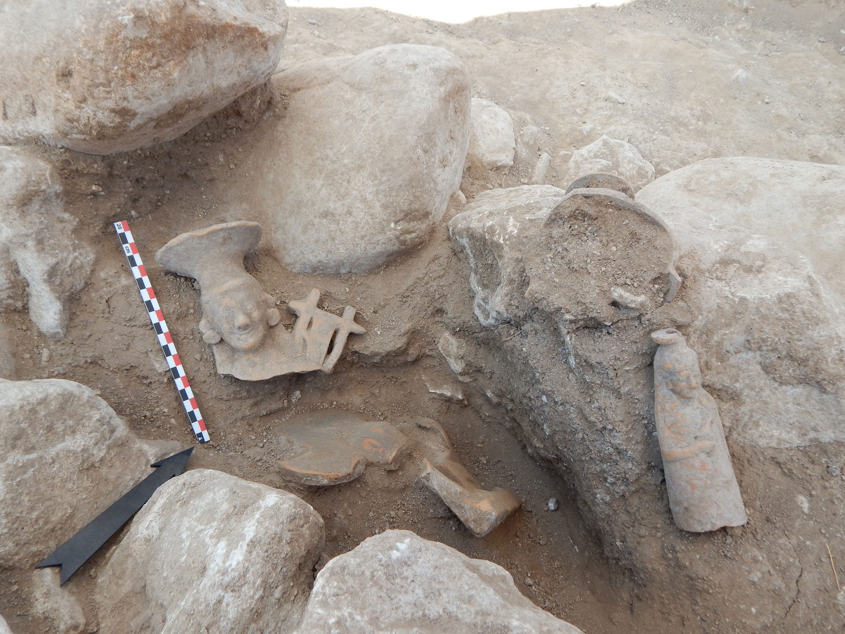 Επίσης, για πρώτη φορά ήρθαν στο φως, σφαιρικός αρύβαλλος από φαγεντιανή και πήλινα ειδώλια καθιστής σε θρόνο γυναικείας μορφής, που κρατά περιστέρι και ένθρονης Σφίγγας με λύρα. Βρέθηκαν δύο πλαστικά αγγεία με όρθια γυναικεία μορφή και με προτομή ανδρικής μυθικής μορφής με δορά ζώου στο κεφάλι, πιθανώς του Ηρακλή, που χρονολογούνται στα αρχαϊκά χρόνια.