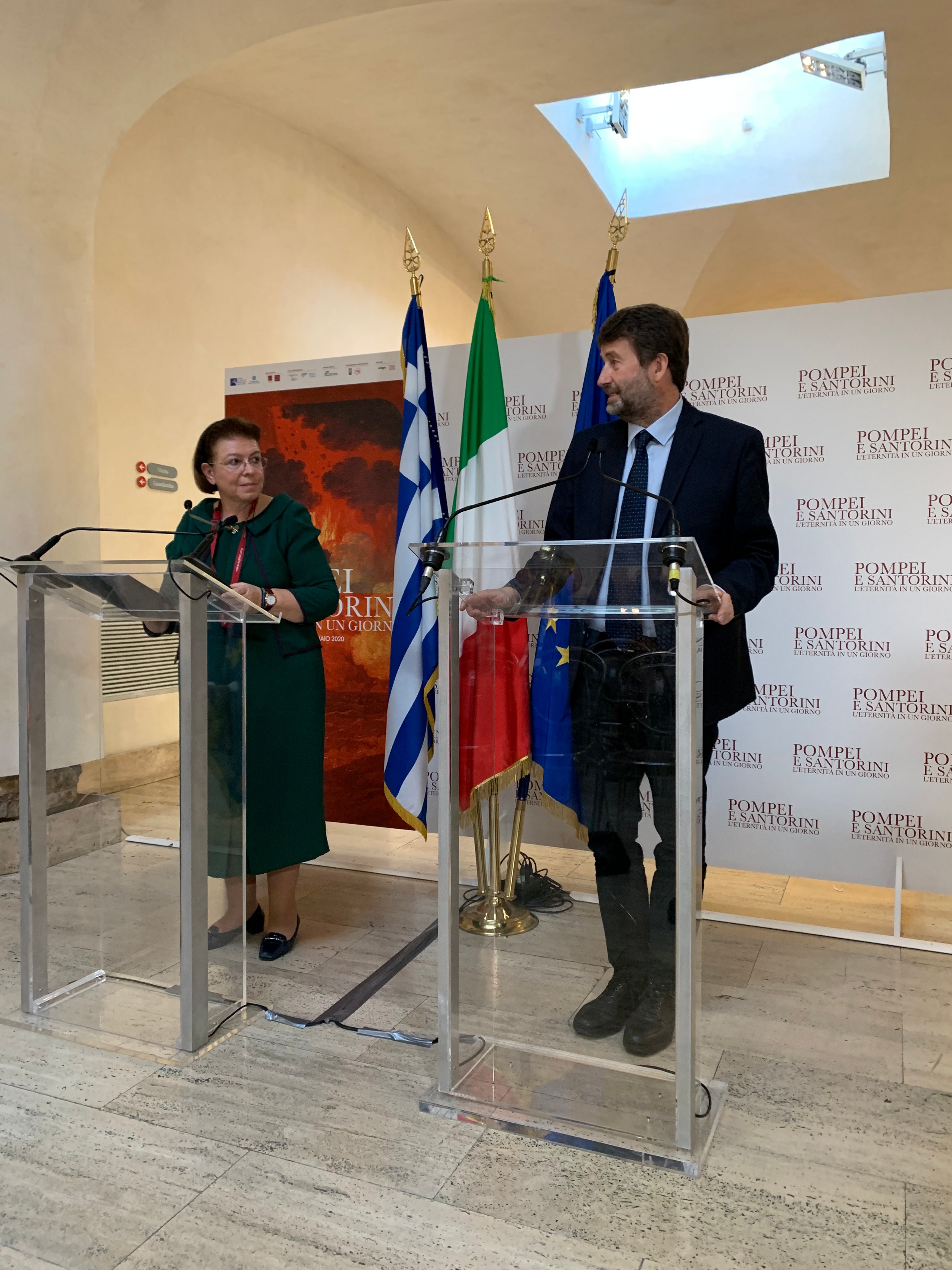 Στη Scuderie del Quirinale, στη Ρώμη, η υπουργός Πολιτισμού και Αθλητισμού κ. Λίνα Μενδώνη εγκαινίασε χθες, 9 Οκτωβρίου, μαζί με τον Ιταλό ομόλογό της, υπουργό Πολιτιστικής Κληρονομιάς και Τουρισμού κ. Ντάριο Φραντζεσκίνι, την έκθεση «Πομπηία και Σαντορίνη: η αιωνιότητα σε μια μέρα».