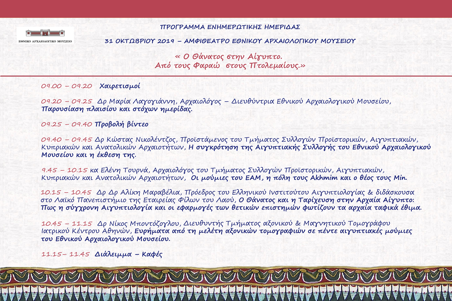 Η Ημερίδα πρόκειται να πραγματοποιηθεί στο αμφιθέατρο του Εθνικού Αρχαιολογικού Μουσείου την Πέμπτη 31 Οκτωβρίου 2019 και ώρα 09.00–14.15, με τη συμμετοχή έγκριτων επιστημόνων από τον χώρο της Ιατρικής, της Αιγυπτιολογίας–Αρχαιολογίας, της Συντήρησης Αρχαιοτήτων και της Ιατροδικαστικής. Οι ομιλητές θα φωτίσουν πολλές πτυχές των εθίμων ταφής και των δοξασιών των Αρχαίων Αιγυπτίων, ενώ θα παρουσιασθούν και οι σχέσεις της Αιγύπτου με το Αιγαίο και τη Μέση Ανατολή.
