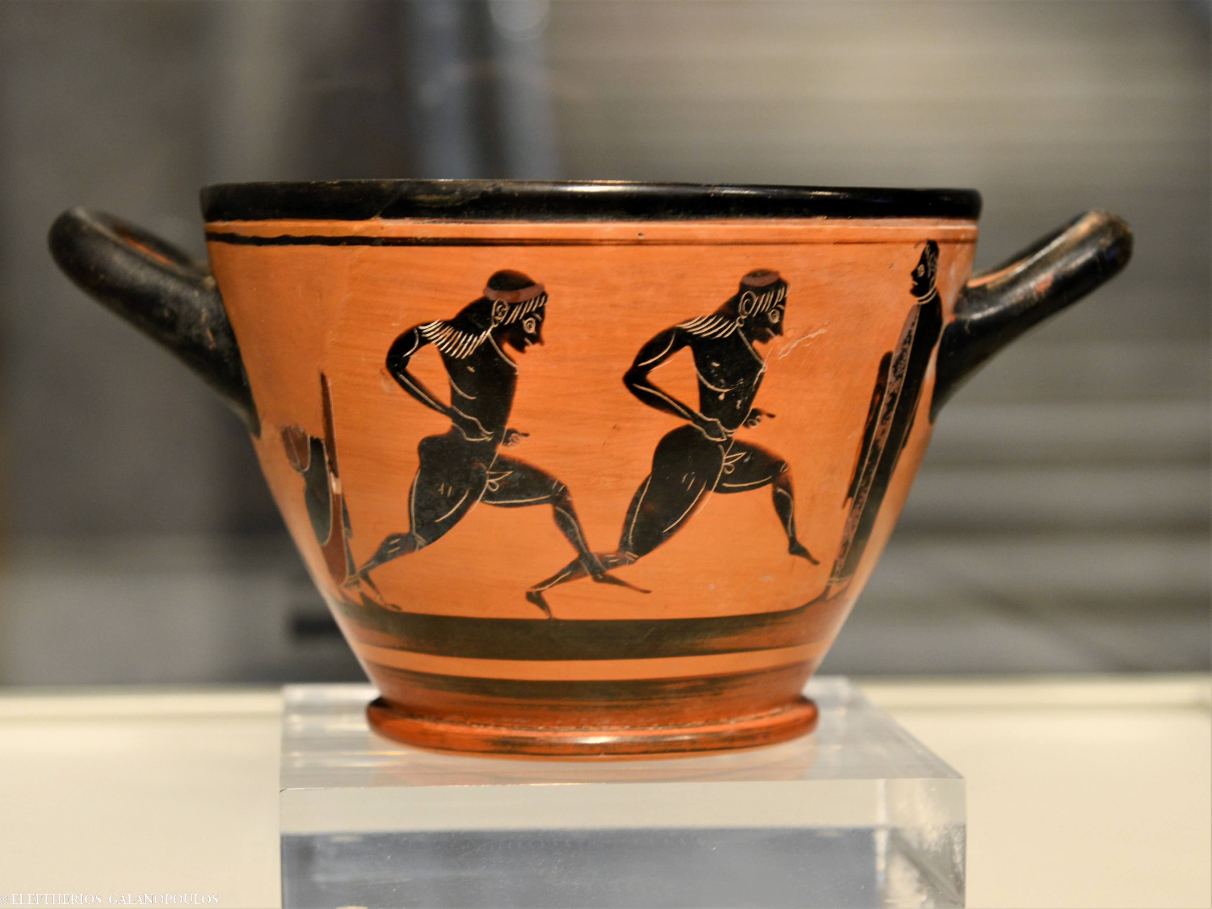 Πρόκειται για τον μελανόμορφο σκύφο του 6ου αιώνα π.Χ., με παράσταση αγώνα δυο δρομέων, υπό το βλέμμα των κριτών, που δόθηκε ως δώρο από τον αρχαιοπώλη Ιωάννη Λάμπρο στον Σπύρο Λούη, μετά τη μεγαλειώδη νίκη του στον μαραθώνιο δρόμο, στους πρώτους Ολυμπιακούς Αγώνες του 1896 στην Αθήνα. Έκτοτε δεν υπήρχαν στοιχεία για την τύχη του επονομαζόμενου «Σκύφου του Λούη».