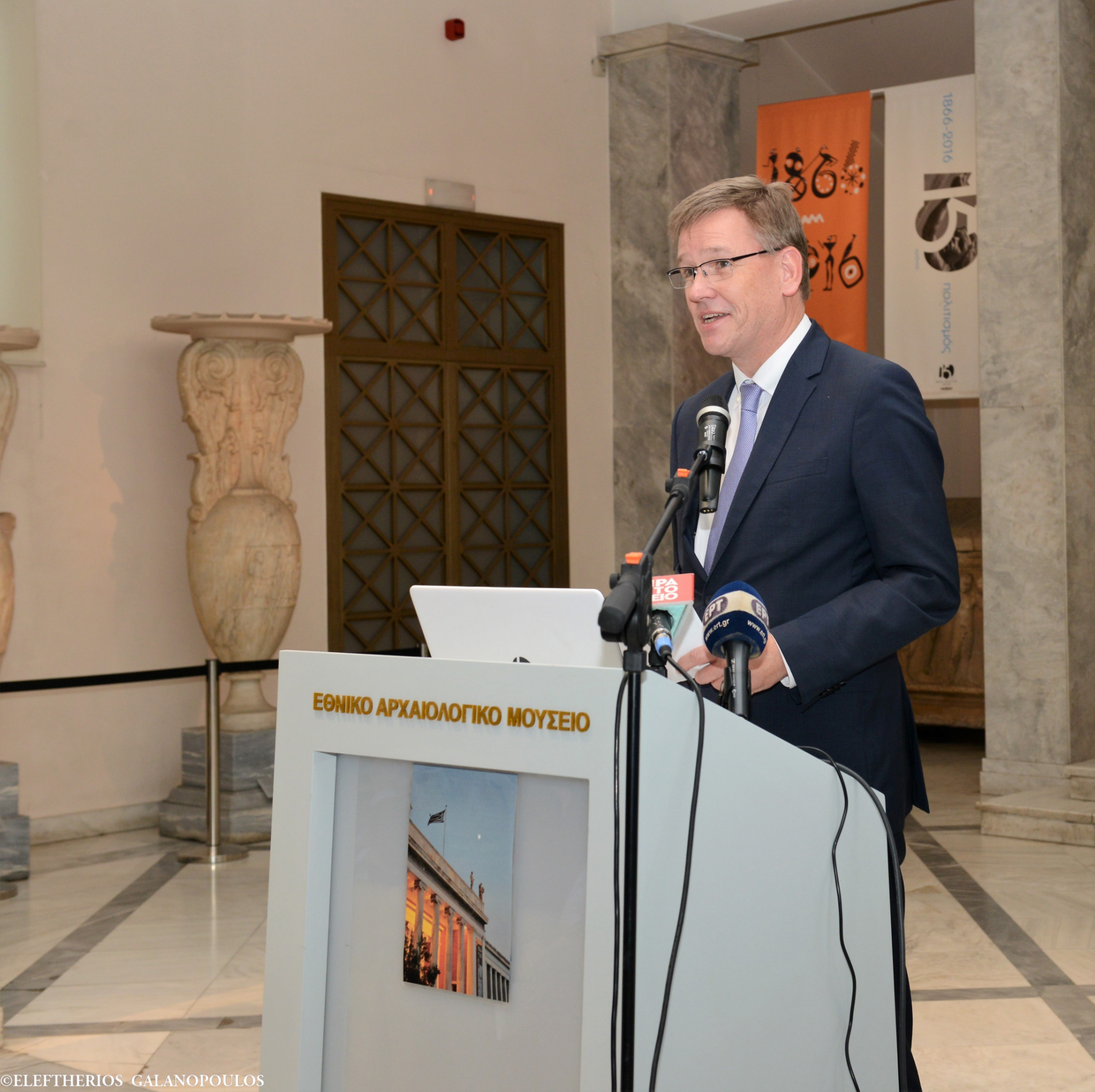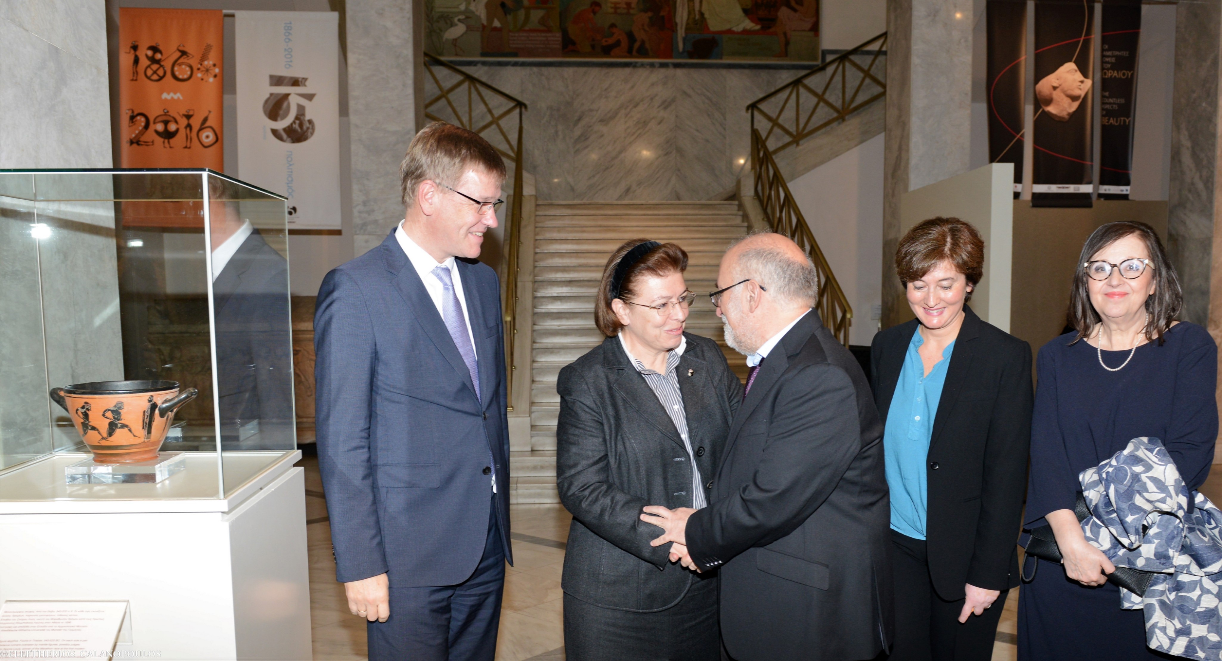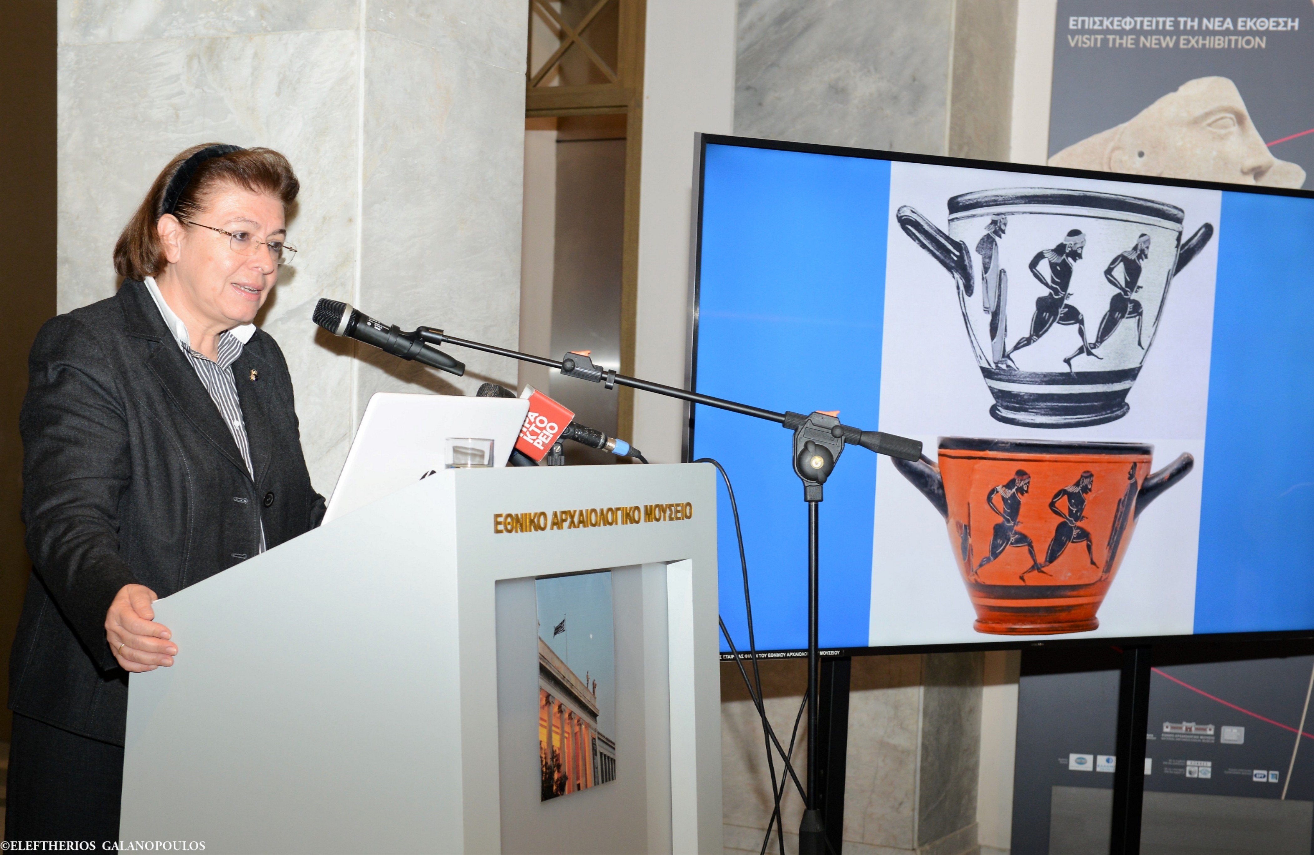 Είναι ιδιαίτερη η χαρά και η τιμή σήμερα, που μαζί με τον Γενικό Γραμματέα του Υπουργείου Πολιτισμού, τον κ. Γιώργο Διδασκάλου, σας υποδεχόμαστε στο Εθνικό Αρχαιολογικό Μουσείο, προκειμένου να έχουμε τη μοναδική χαρά να παραλαμβάνουμε από εκλεκτούς συναδέλφους ένα εξαιρετικά σημαντικό αρχαίο σκύφο. Σημαντικό, διότι συνδέεται άμεσα με την Ιστορία της νεότερης Ελλάδας και με τους πρώτους Ολυμπιακούς Αγώνες, οι οποίοι αναβιώνουν μετά από εκατοντάδες χρόνια.