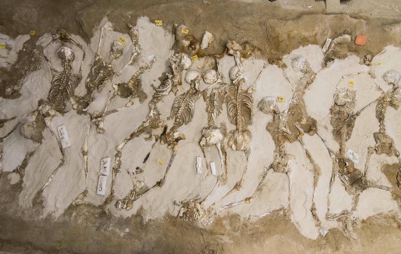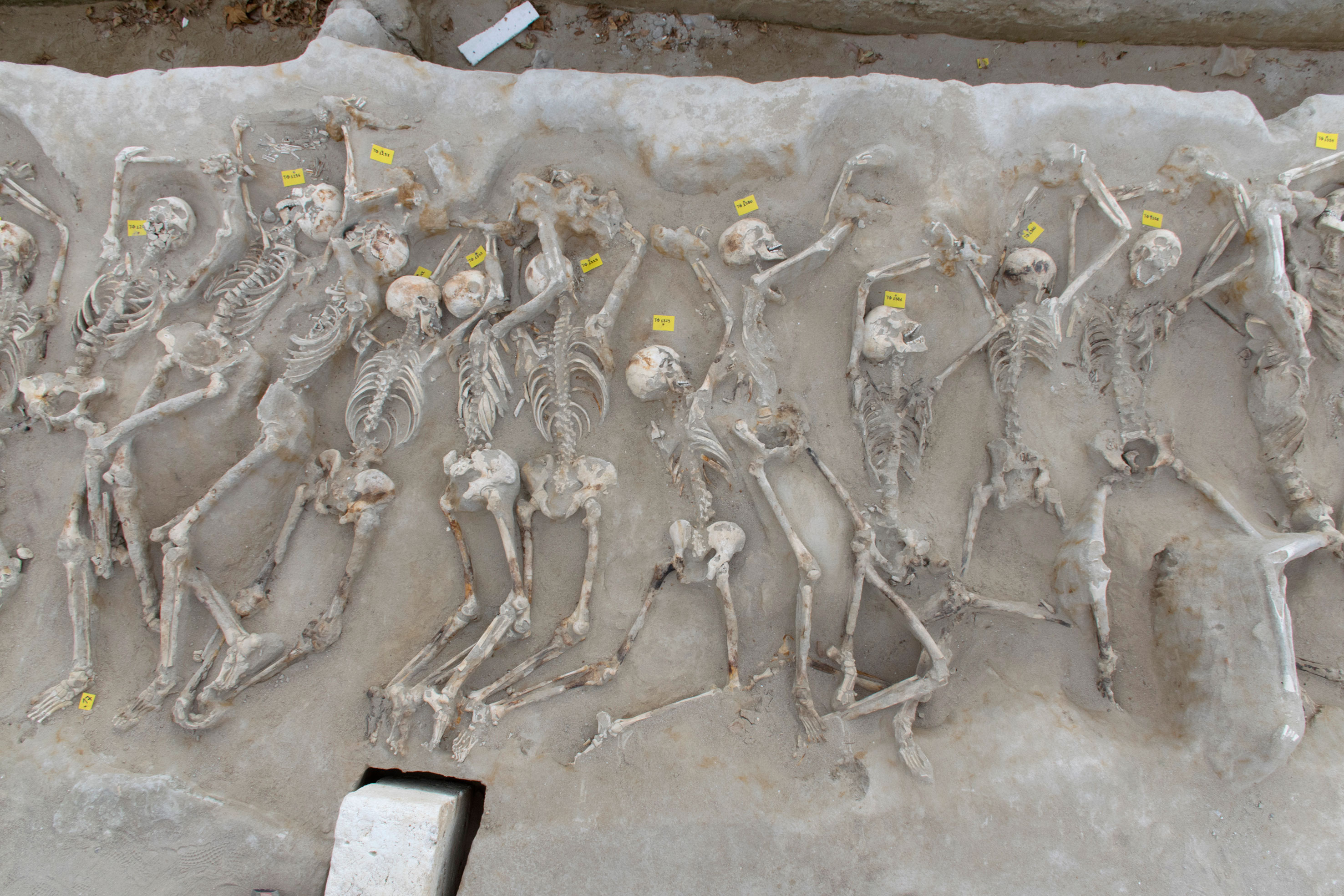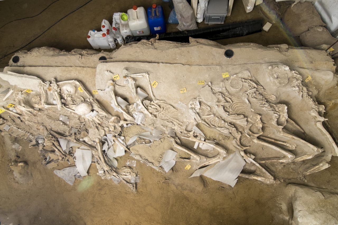 Η μαζική ταφή αποτελείται από 79 σκελετούς σε τρεις σειρές. Για την προστασία τους χρησιμοποιήθηκε μία τέντα η οποία θα είχε διάρκεια ενός χρόνου, αλλά παραμένει να καλύπτει το σκάμμα ως σήμερα. Πρέπει το ΚΑΣ να γνωμοδοτήσει για την τύχη του ευρήματος με τα σημερινά δεδομένα. Όλοι μιλάμε για την εξαιρετική προστασία που εξασφαλίζομε αλλά αφήνουμε μνημεία στο έλεος τους.