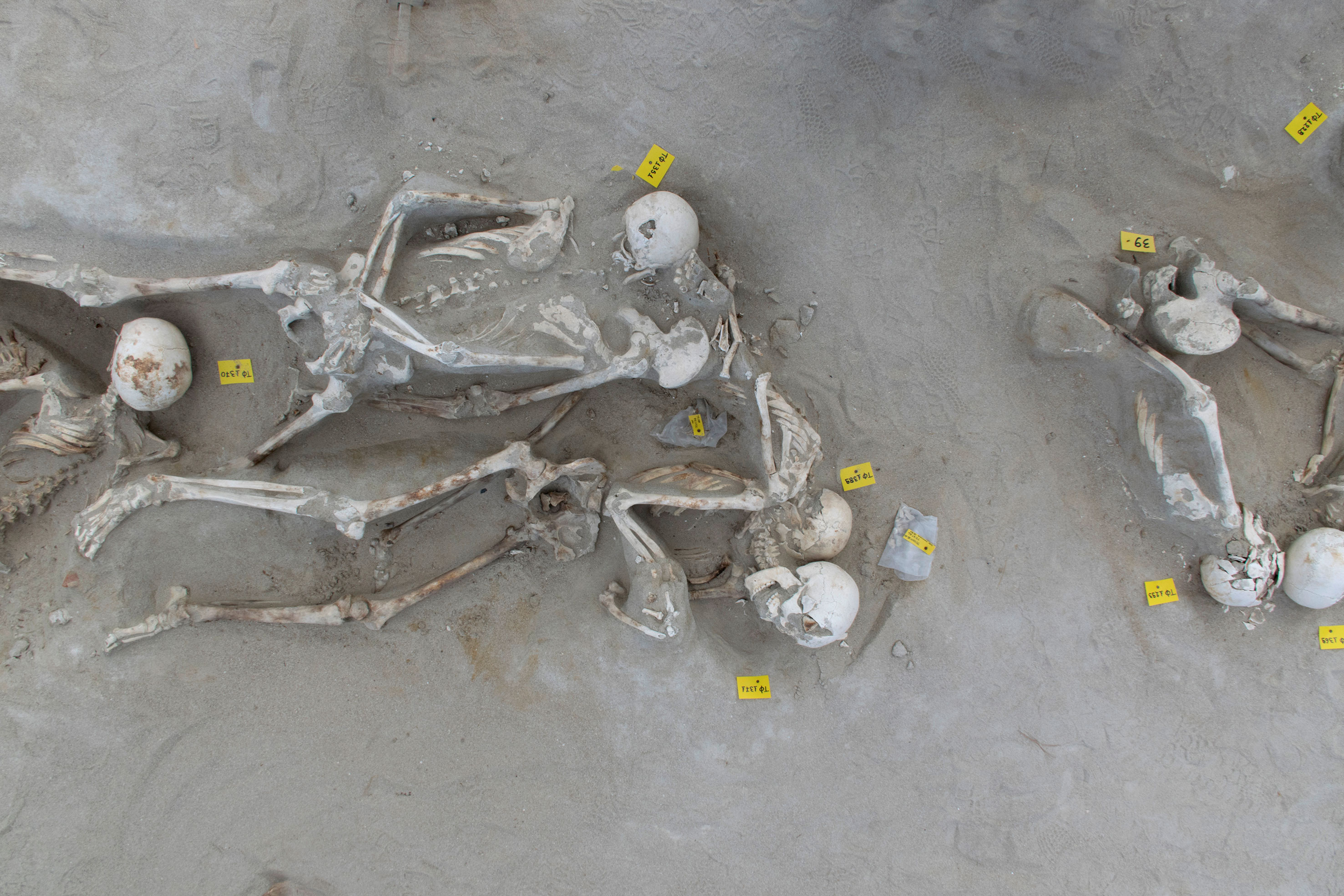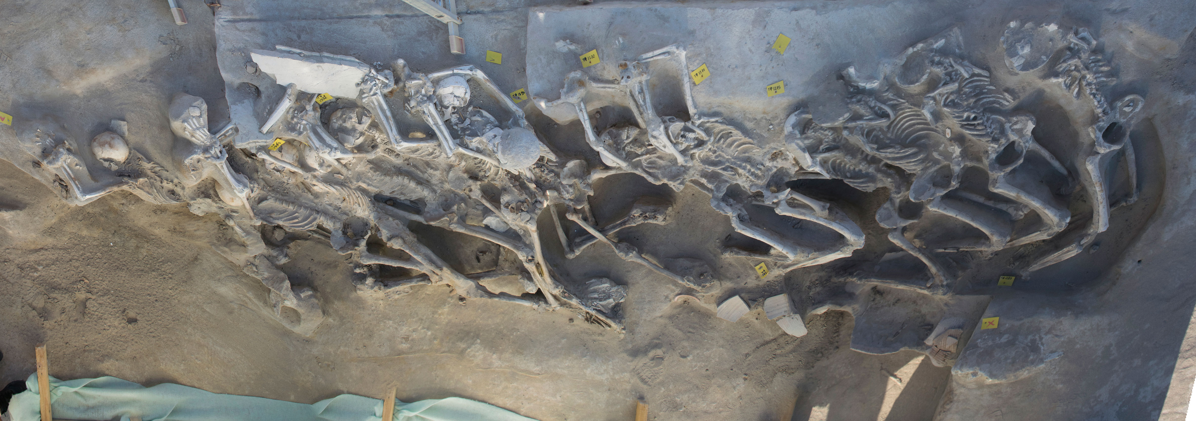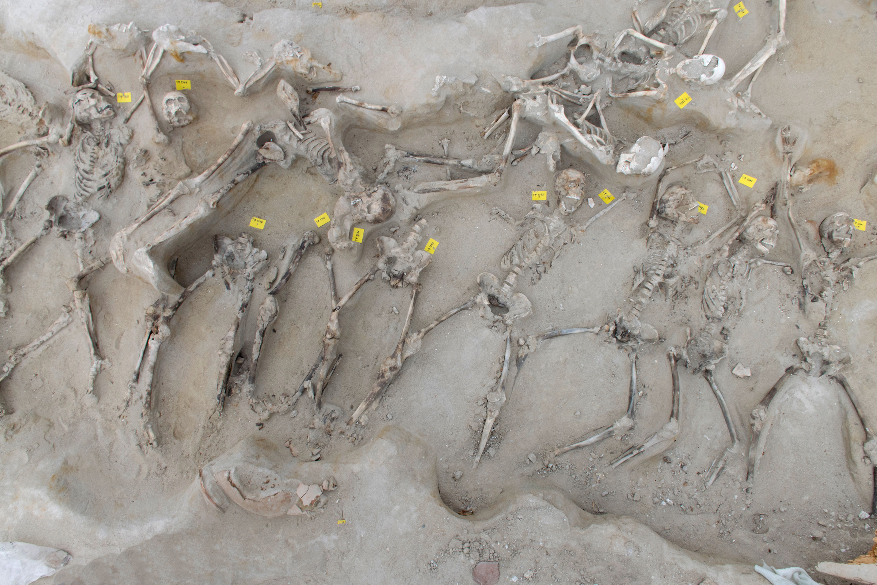Η μαζική ταφή αποτελείται από 79 σκελετούς σε τρεις σειρές. Για την προστασία τους χρησιμοποιήθηκε μία τέντα η οποία θα είχε διάρκεια ενός χρόνου, αλλά παραμένει να καλύπτει το σκάμμα ως σήμερα. Πρέπει το ΚΑΣ να γνωμοδοτήσει για την τύχη του ευρήματος με τα σημερινά δεδομένα. Όλοι μιλάμε για την εξαιρετική προστασία που εξασφαλίζομε αλλά αφήνουμε μνημεία στο έλεος τους.