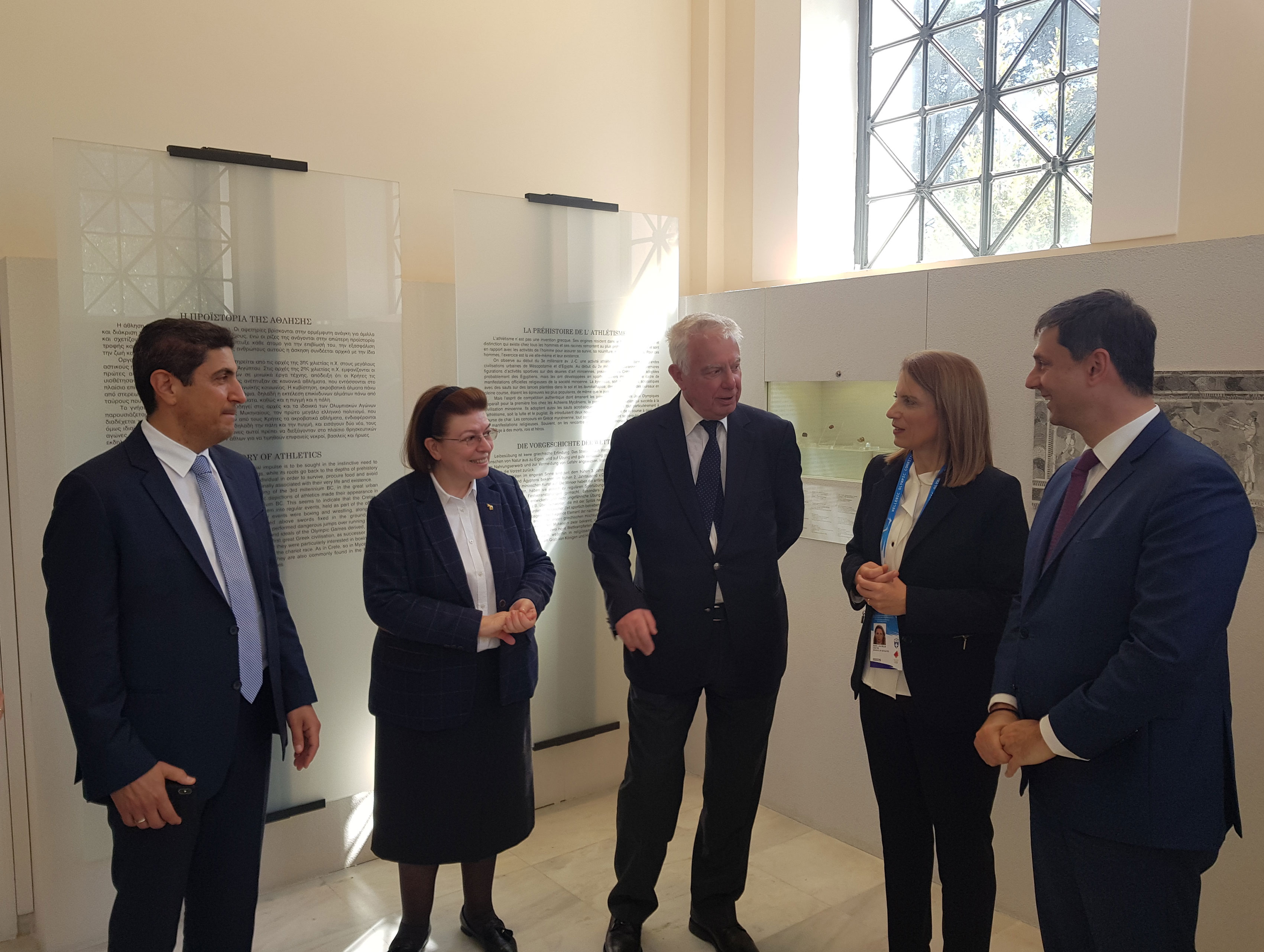Μετά το πέρας της τελετής η κ. Λίνα Μενδώνη συνόδευσε τον αντιπρόεδρο της Κυβέρνησης κ. Παναγιώτη Πικραμμένο, τον υπουργό Τουρισμού κ. Χάρη Θεοχάρη και τον υφυπουργό Αθλητισμού κ. Λευτέρη Αυγενάκη στο Μουσείο των Ολυμπιακών Αγώνων, όπου εκτίθενται στο πλαίσιο περιοδικής έκθεσης τα δύο κύπελλα, τα οποία απενεμήθησαν ως έπαθλα, στους Ολυμπιακούς Αγώνες της Αθήνας το 1896, στον πρώτο Ελληνα Ολυμπιονίκη Σπύρο Λούη. Πρόκειται για το αργυρό κύπελλο Bréal και τον μελανόμορφο σκύφο. Το πρώτο, αθλοθετήθηκε για τον νικητή του Μαραθωνίου από τον εμπνευστή του αγωνίσματος, Michel Bréal. Το έπαθλο είχε χαθεί για πολλά χρόνια και αποκτήθηκε το 2012 σε δημοπρασία από το Ίδρυμα Σταύρος Νιάρχος, ενώ εκτίθεται μόνιμα στο ΚΠΙΣΝ. Ο σκύφος δωρήθηκε στον Λούη από τον αρχαιοπώλη Ιωάννη Λάμπρο, έπειτα από άδεια του Γεωργίου. Το έπαθλο επεστράφη πρόσφατα από το Αρχαιολογικό Μουσείο του Πανεπιστημίου του Münster της Γερμανίας και εκτίθεται πλέον μόνιμα στο Μουσείο της Ιστορίας των Ολυμπιακών Αγώνων στην Αρχαιότητα, στην Ολυμπία.