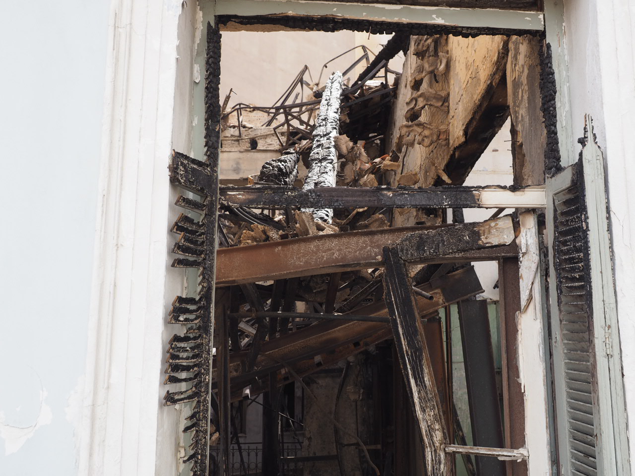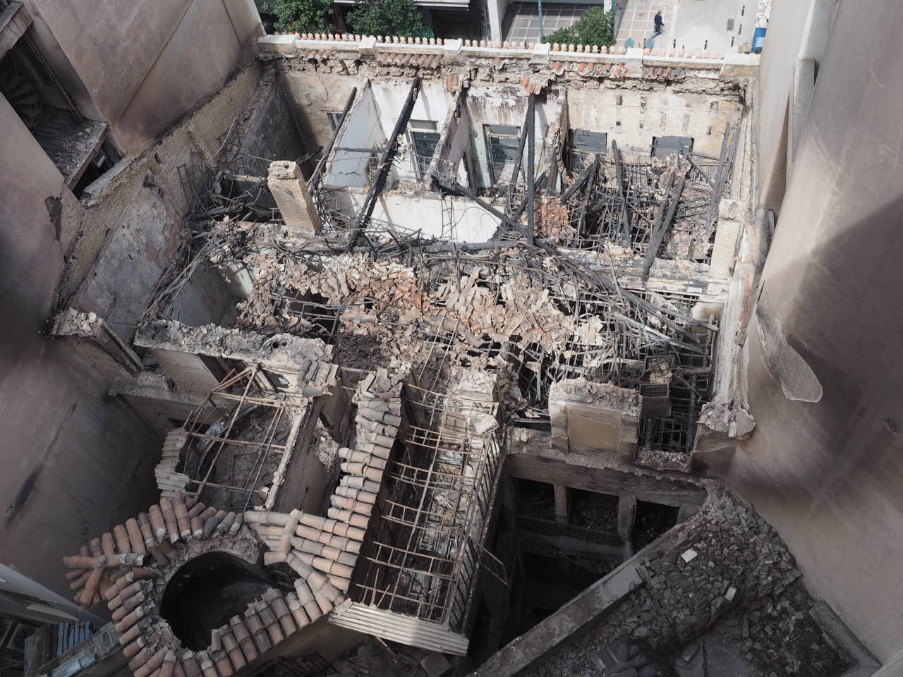 Η πυρκαγιά φαίνεται να ξεκίνησε και να περιορίστηκε στον β΄ όροφο του αρχικού κτηρίου, με αποτέλεσμα να έχει καταστραφεί μέρος του ξύλινου πατώματος του β' ορόφου και να έχει καταρρεύσει η ξύλινη στέγη. Ωστόσο, η νεοκλασική όψη επί της οδού Σταδίου, ο Α΄ όροφος, τα δομικά στοιχεία του ισογείου, του α΄ ορόφου και του υπογείου δεν έχουν υποστεί ιδιαίτερες βλάβες. Οι εσωτερικές νεωτερικές διαρρυθμίσεις τα πατάρια και οι ψευδοροφές έχουν υποστεί αρκετές ζημιές λόγω της κατάρρευσης του δαπέδου του υπερκείμενου ορόφου. Επίσης, έχουν διασωθεί (με αρκετές ζημιές) το σημαντικό παλαιό ξύλινο κλιμακοστάσιο του κτηρίου και ο ζωγραφικός διάκοσμος του Α΄ ορόφου.