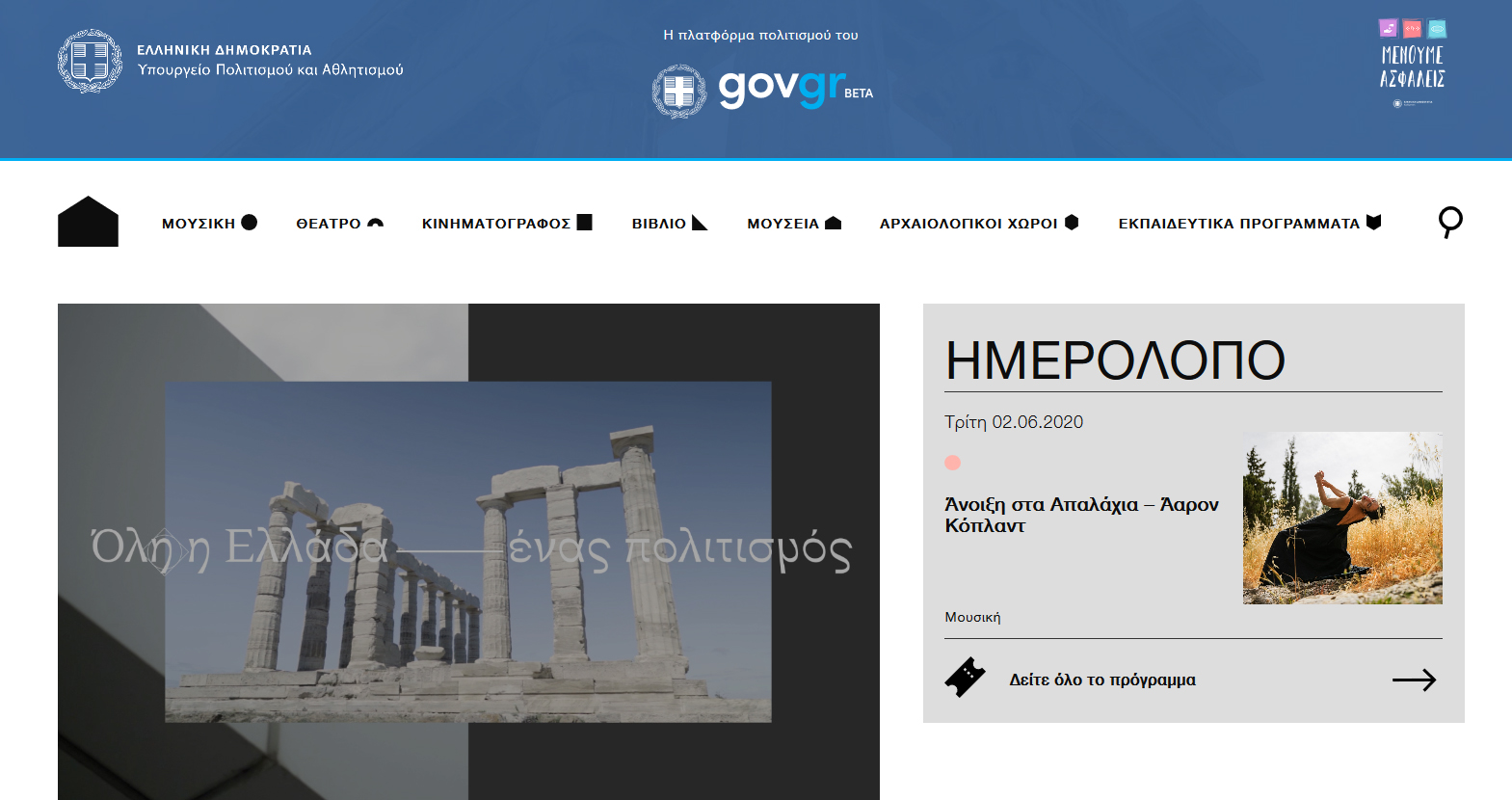 Το Υπουργείο Πολιτισμού και Αθλητισμού, με την πολύτιμη συνεργασία και την τεχνική υποστήριξη του Υπουργείου Ψηφιακής Διακυβέρνησης, παρουσιάζει σήμερα την ηλεκτρονική πλατφόρμα Πολιτισμού: https://digitalculture.gov.gr