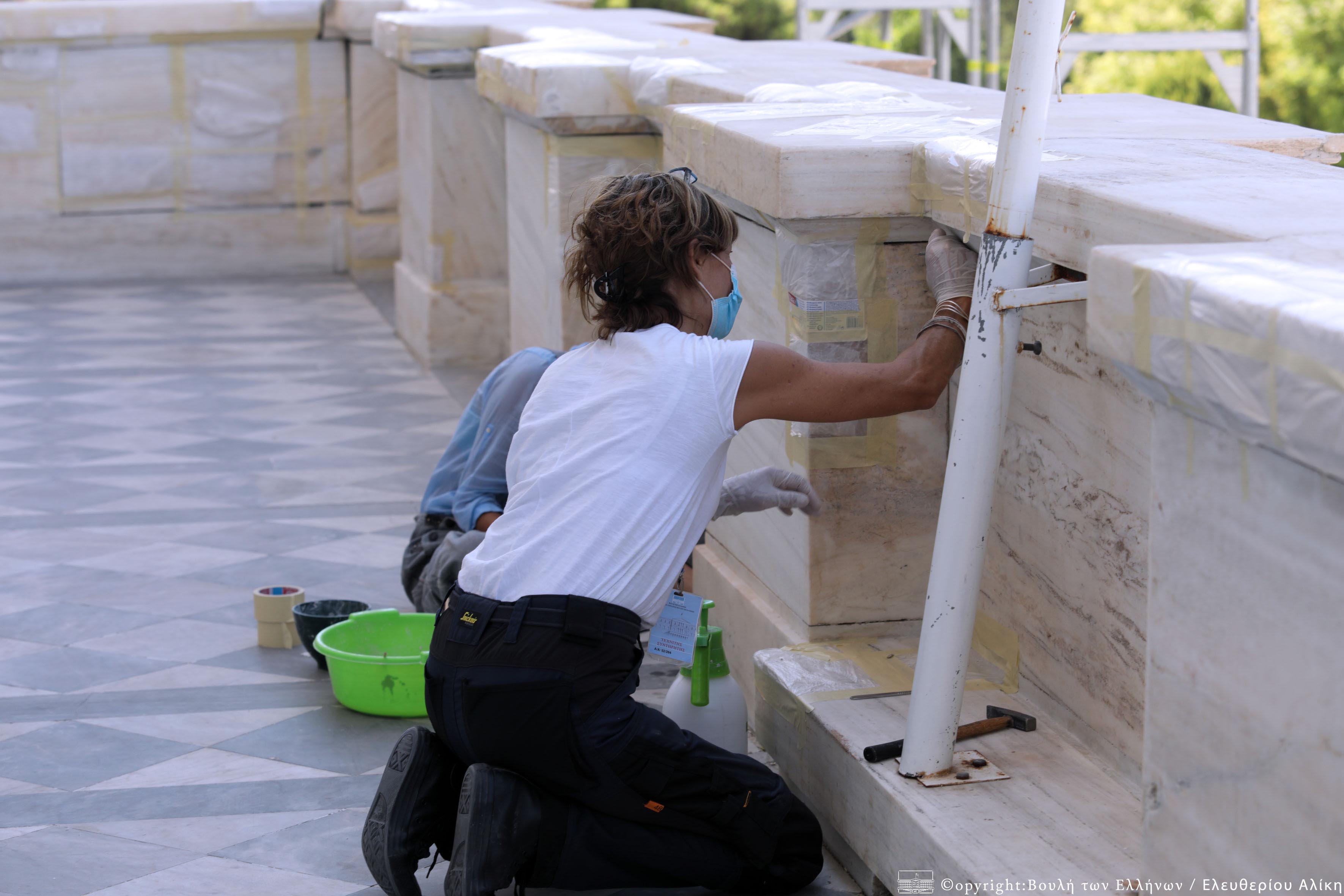 - Στερέωση της λίθινης επιφάνειας των αρχιτεκτονικών στοιχείων των πρόπυλων της Βουλής.