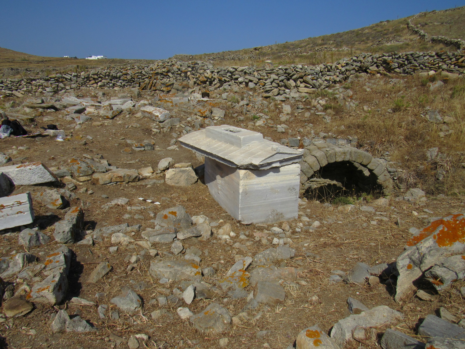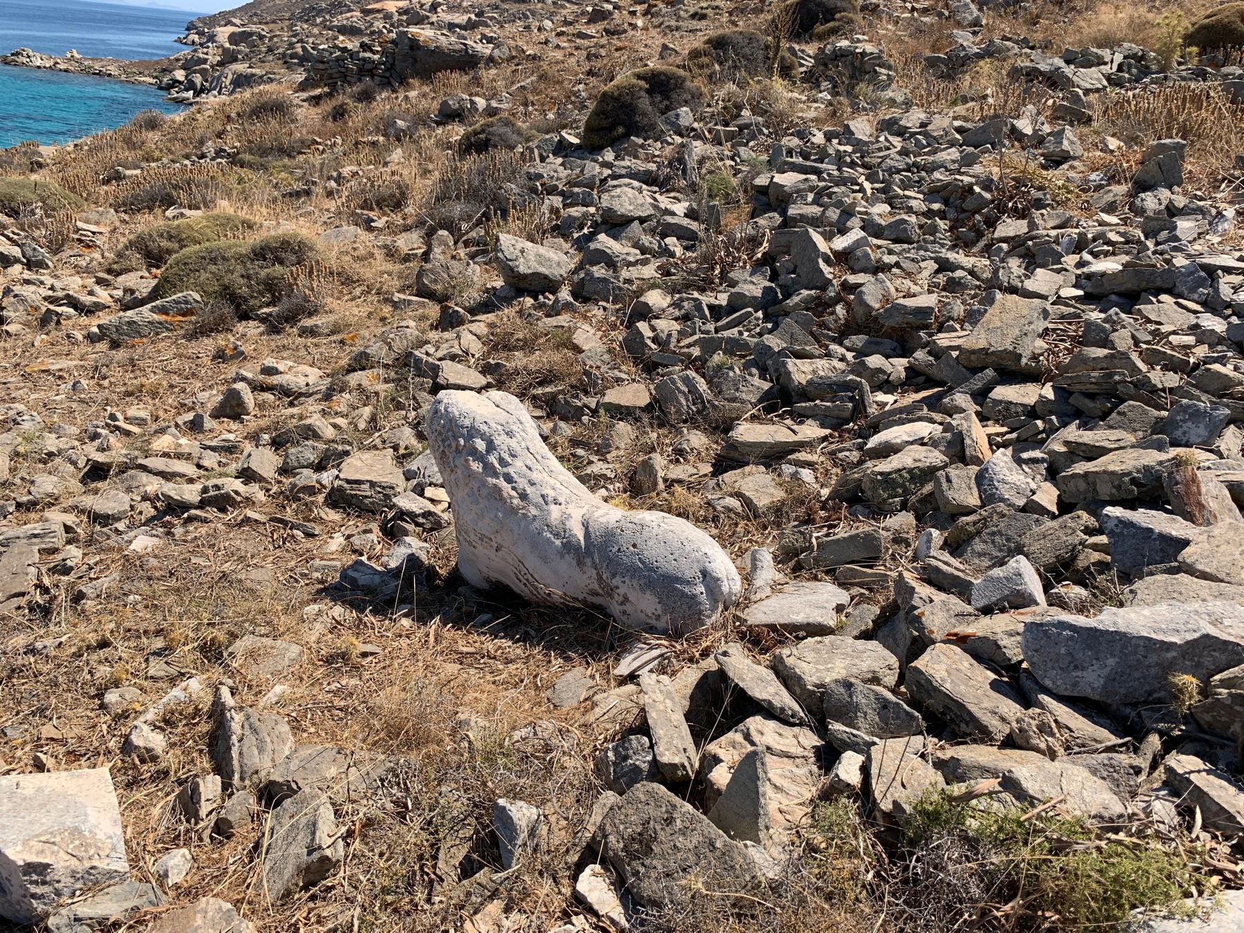 Εικ. 3. Ταφικός λέων ανάμεσα στα ερείπια κατασκευών της δηλιακής νεκρόπολης στη Ρήνεια.