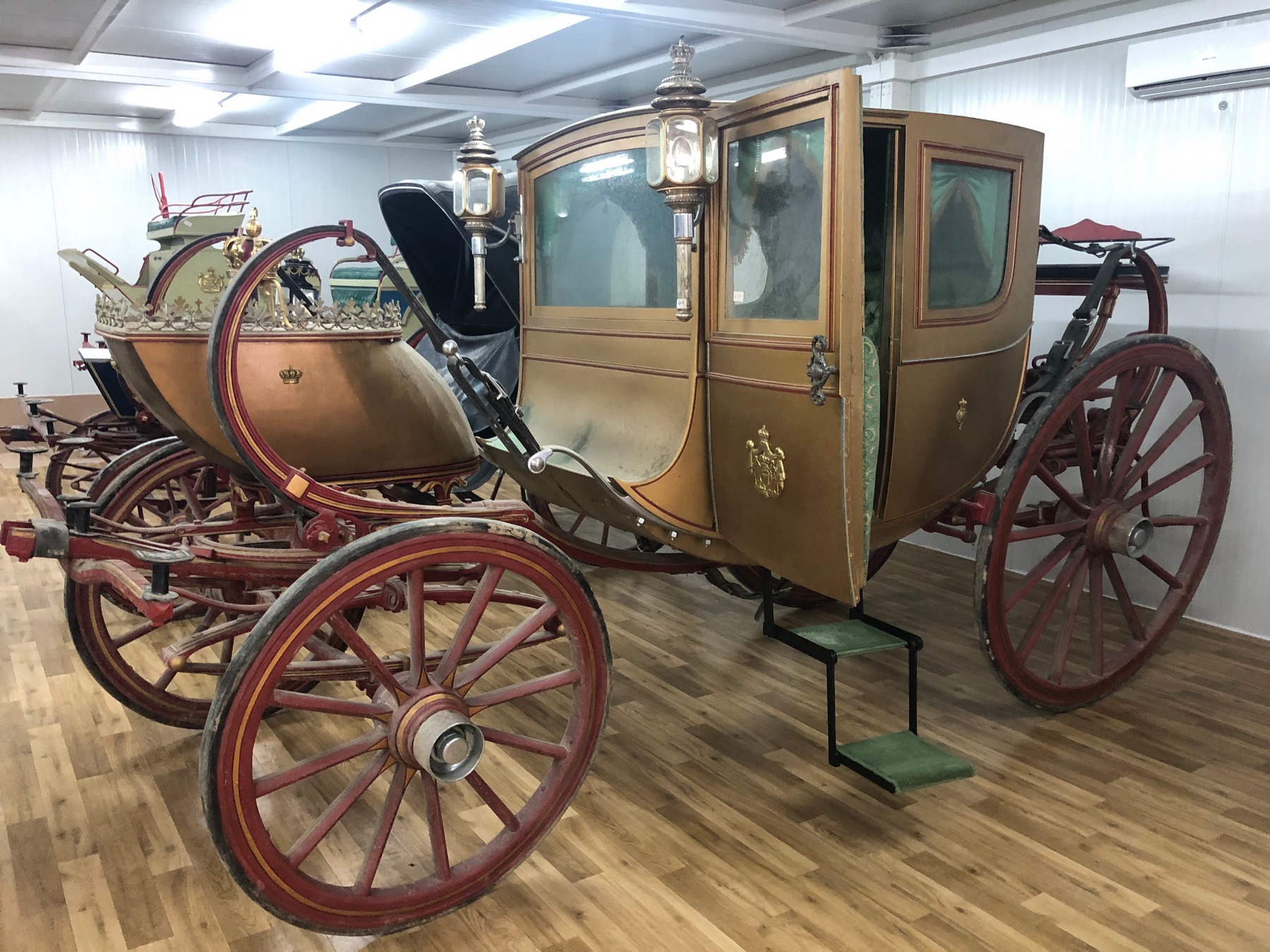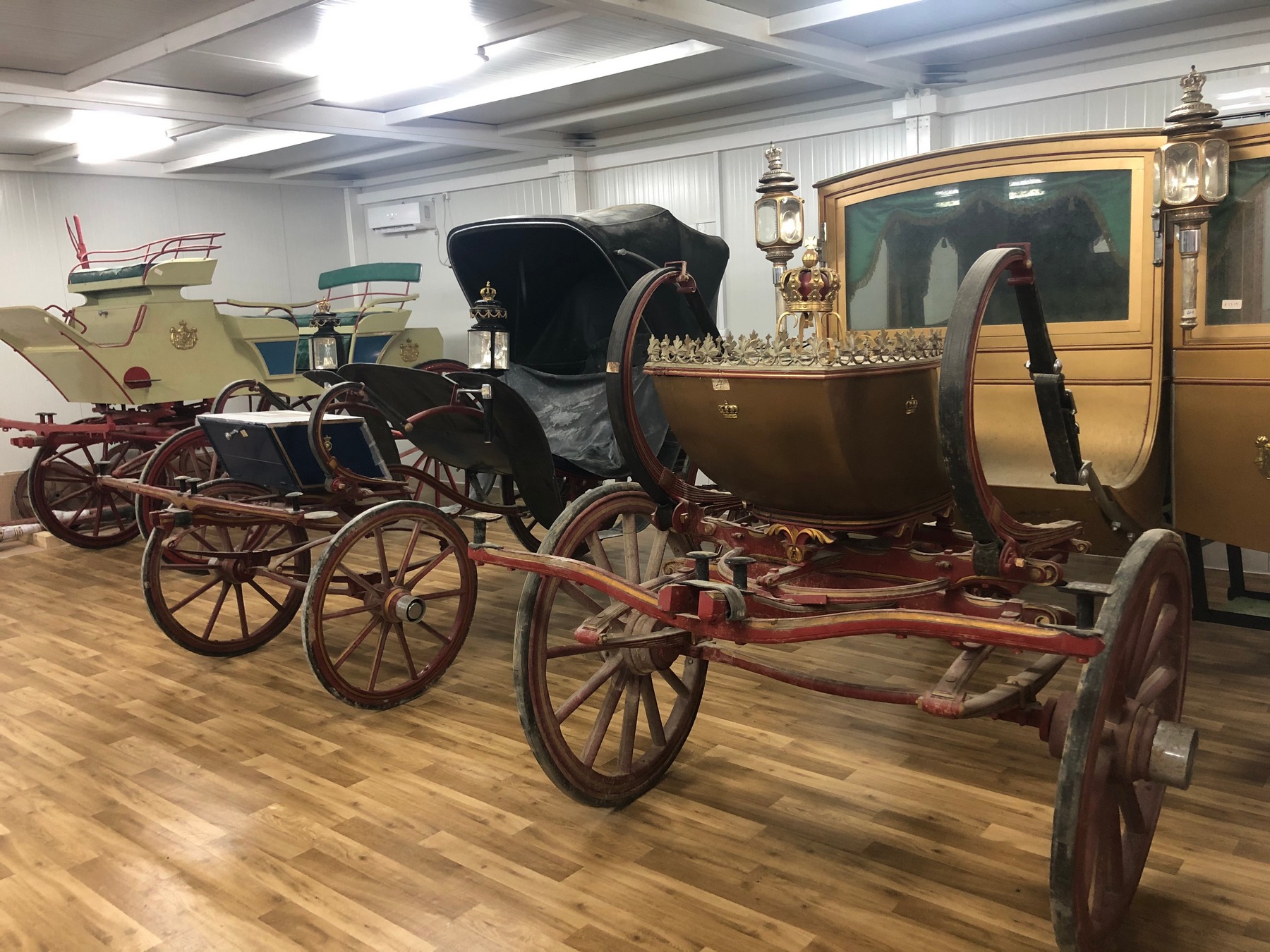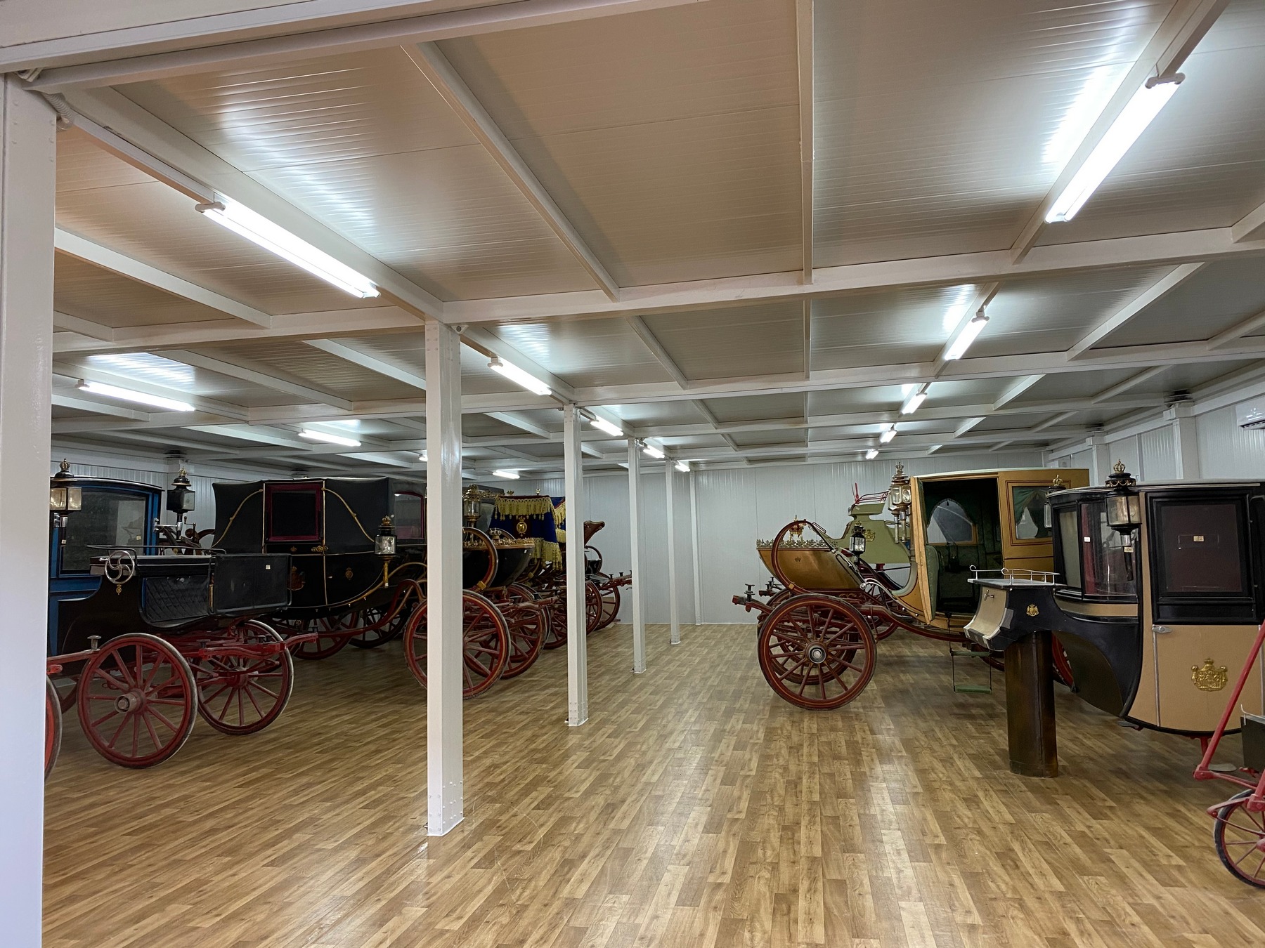 Από τον Στάβλο μεταφέρθηκαν και οι άμαξες της τ. βασιλικής οικογένειας, οι οποίες τοποθετήθηκαν σε νέο αποθηκευτικό χώρο σύγχρονων προδιαγραφών με συνθήκες αποθήκευσης ασφάλειας και προστασίας, ο οποίος κατασκευάστηκε με την χορηγία της ΑΜΚΕ Αιγέας, δίπλα στον χώρο που φυλάσσονται τα αυτοκίνητα της τ. βασιλικής οικογένειας. Οι άμαξες δέχθηκαν τις επείγουσες σωστικές επεμβάσεις από το κλιμάκιο συντηρητών της ΔΣΑΝΜ για την προσωρινή συγκράτηση και προστασία των αποκολλημένων χρωματικών στρωμάτων και την απομάκρυνση ρύπων και χαλαρών επικαθίσεων, μετά από τη μακρόχρονη παραμονή 52 ετών, εντός του κτηρίου του Στάβλου και σε εντελώς ακατάλληλες συνθήκες. Πρόκειται για 12 άμαξες, με σημαντικότερες δυο από αυτές: Την κλειστή άμαξα που χρησιμοποιήθηκε στον γάμο της Βασίλισσας Σοφίας της Ισπανίας, τύπου coach -είχε αγοραστεί από τον βασιλιά Γεώργιο Α' το 1871- και την ειδικά τροποποιημένη, ανοιχτή άμαξα, τύπου landau, που χρησιμοποιήθηκε στους γάμους του τ. Βασιλιά Κωνσταντίνου και της Άννας Μαρίας. Επίσης, περιλαμβάνονται μια χρυσή άμαξα τύπου Coupe, 3 άμαξες τύπου Berlin, 2 ανοιχτές τύπου Phaethon, μία κυνηγετική και 3 μόνιππα.