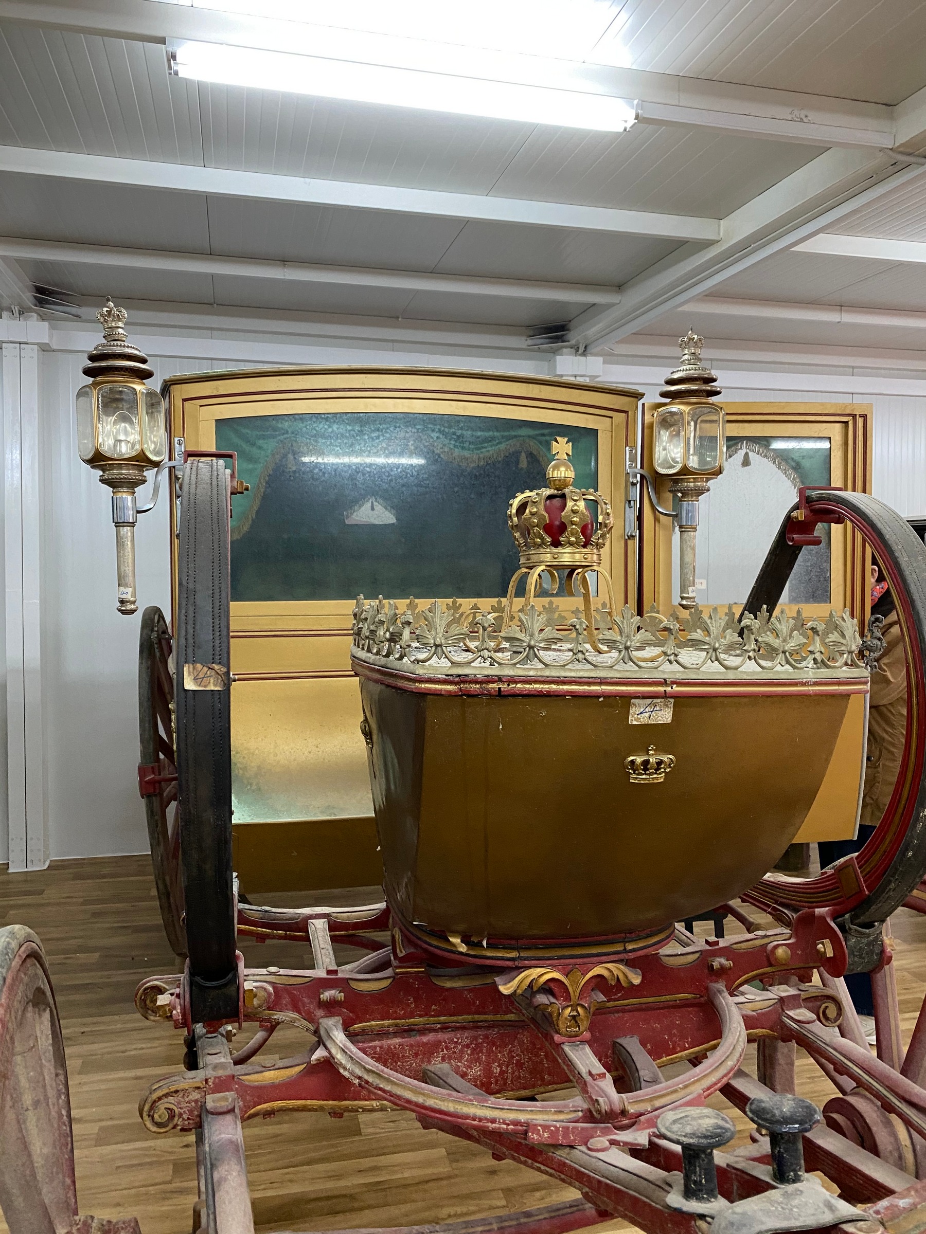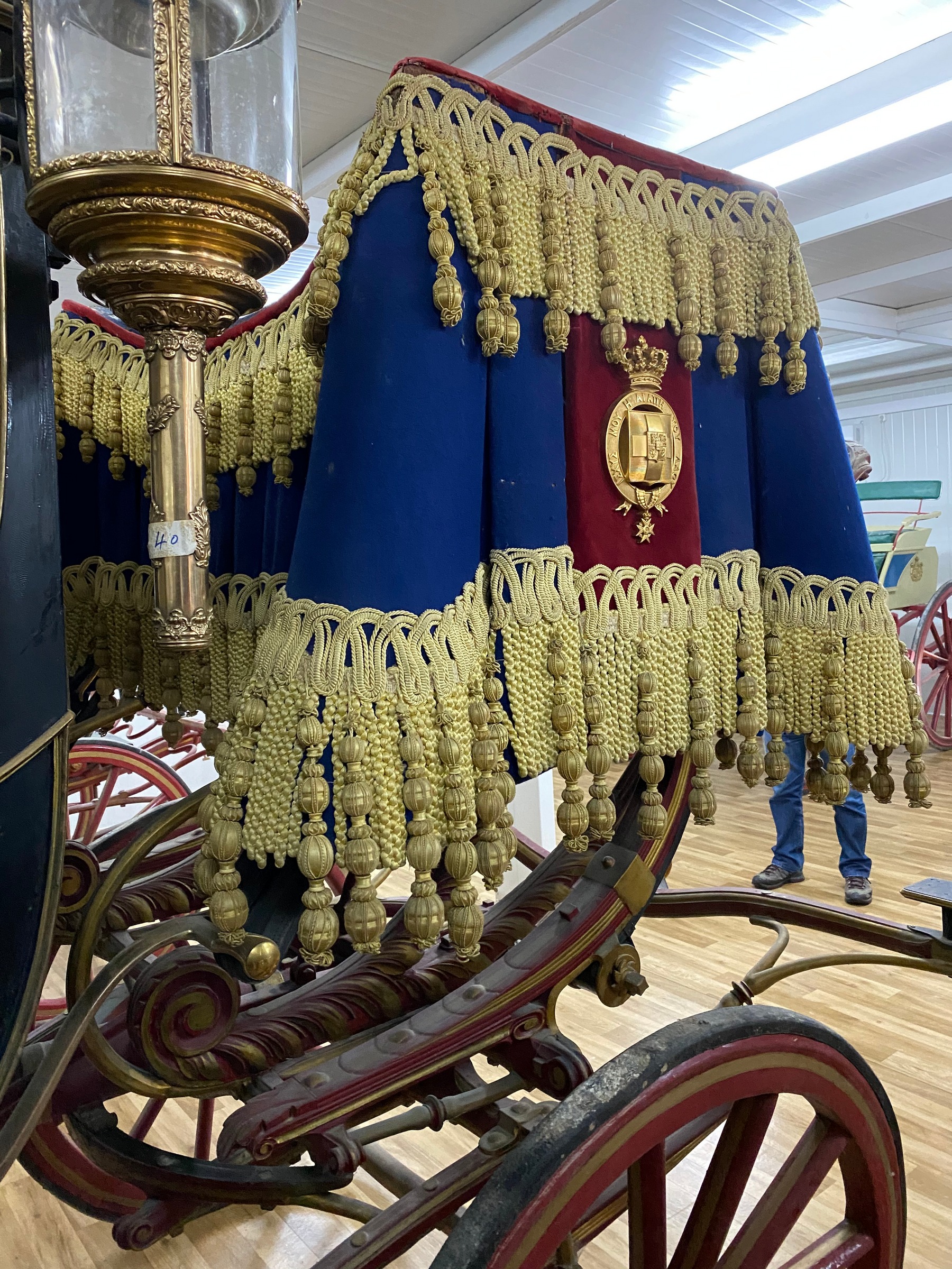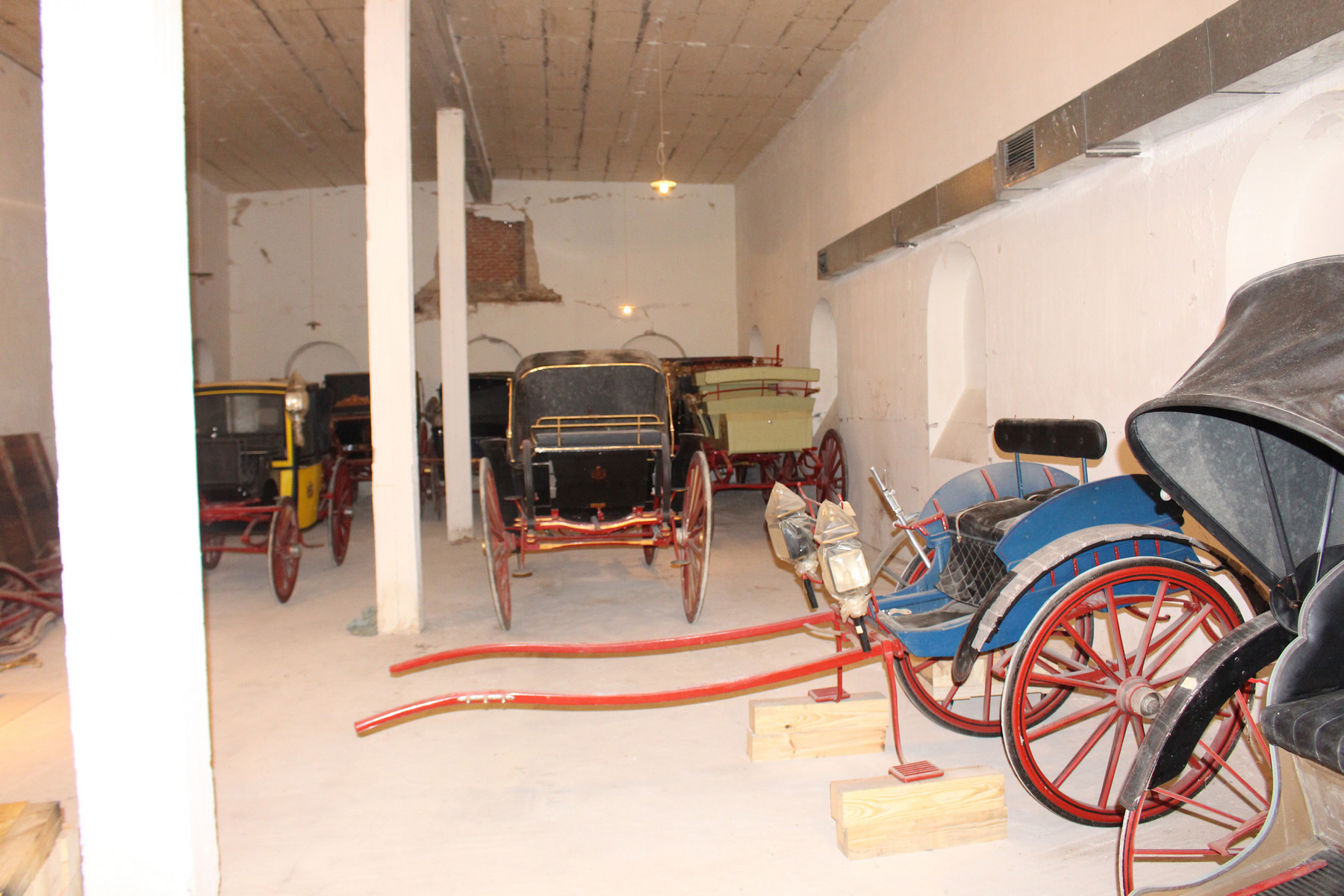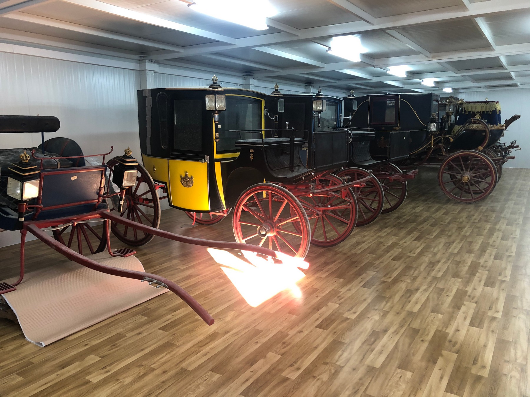 Από τον Στάβλο μεταφέρθηκαν και οι άμαξες της τ. βασιλικής οικογένειας, οι οποίες τοποθετήθηκαν σε νέο αποθηκευτικό χώρο σύγχρονων προδιαγραφών με συνθήκες αποθήκευσης ασφάλειας και προστασίας, ο οποίος κατασκευάστηκε με την χορηγία της ΑΜΚΕ Αιγέας, δίπλα στον χώρο που φυλάσσονται τα αυτοκίνητα της τ. βασιλικής οικογένειας. Οι άμαξες δέχθηκαν τις επείγουσες σωστικές επεμβάσεις από το κλιμάκιο συντηρητών της ΔΣΑΝΜ για την προσωρινή συγκράτηση και προστασία των αποκολλημένων χρωματικών στρωμάτων και την απομάκρυνση ρύπων και χαλαρών επικαθίσεων, μετά από τη μακρόχρονη παραμονή 52 ετών, εντός του κτηρίου του Στάβλου και σε εντελώς ακατάλληλες συνθήκες. Πρόκειται για 12 άμαξες, με σημαντικότερες δυο από αυτές: Την κλειστή άμαξα που χρησιμοποιήθηκε στον γάμο της Βασίλισσας Σοφίας της Ισπανίας, τύπου coach -είχε αγοραστεί από τον βασιλιά Γεώργιο Α' το 1871- και την ειδικά τροποποιημένη, ανοιχτή άμαξα, τύπου landau, που χρησιμοποιήθηκε στους γάμους του τ. Βασιλιά Κωνσταντίνου και της Άννας Μαρίας. Επίσης, περιλαμβάνονται μια χρυσή άμαξα τύπου Coupe, 3 άμαξες τύπου Berlin, 2 ανοιχτές τύπου Phaethon, μία κυνηγετική και 3 μόνιππα.