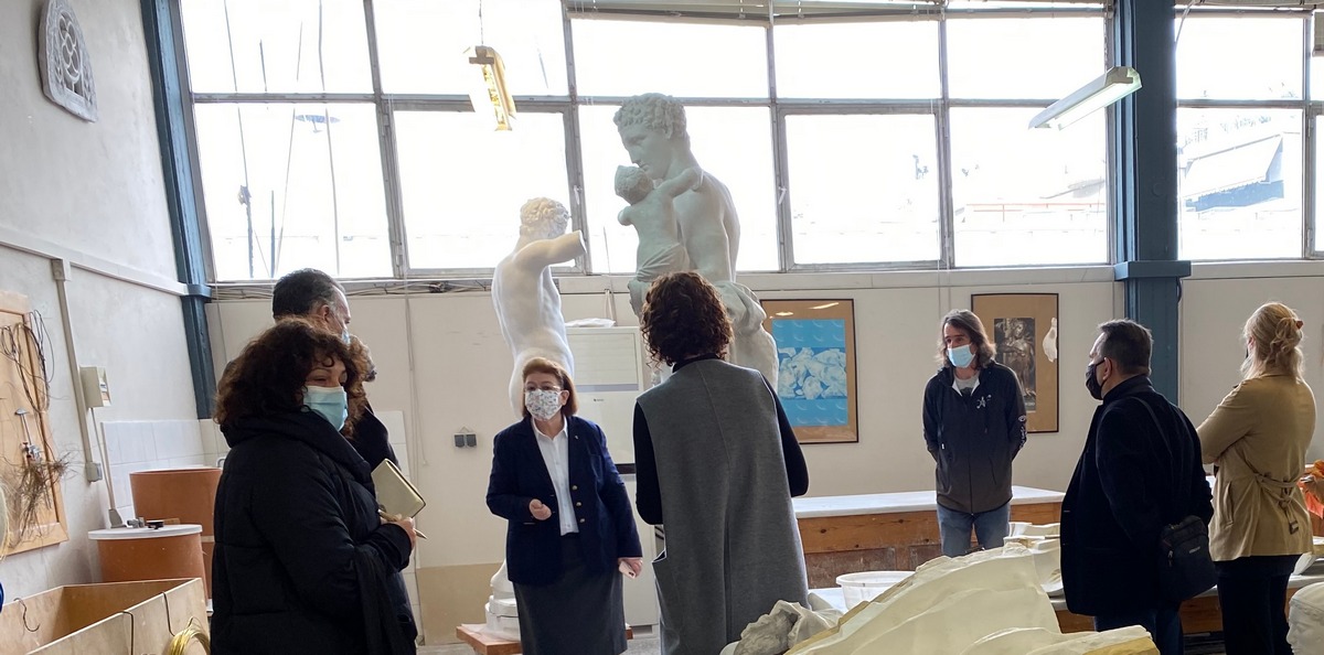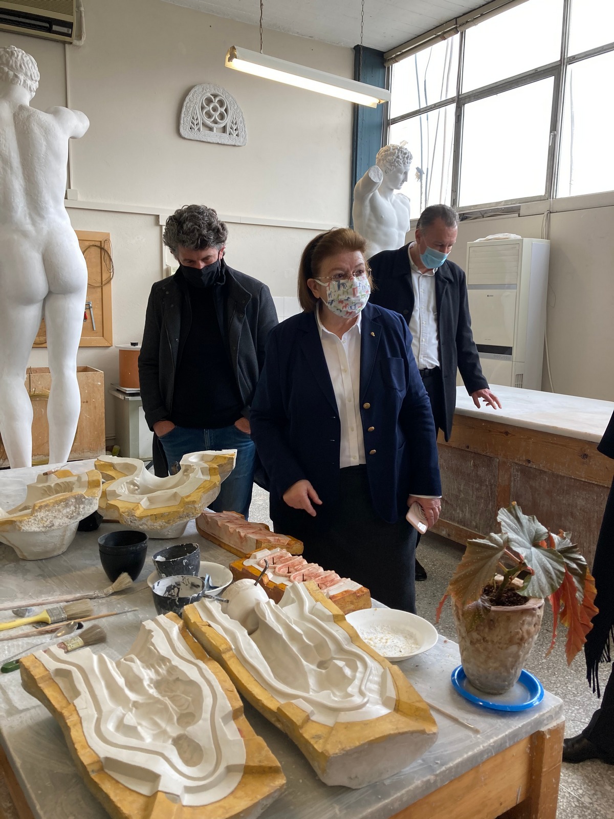 Τη Λίνα Μενδώνη υποδέχθηκαν και ξενάγησαν στους χώρους των εργαστηρίων και στην εντυπωσιακή μοντελοθήκη των εκμαγείων του ΟΔΑΠ ο Πρόεδρος του Δ.Σ. του Οργανισμού Παναγιώτης Νταής, ο Γενικός Διευθυντής Ηλίας Πατσαρούχας, η Αλεξάνδρα Χαριτάτου, εκτελεστικό μέλος του Δ.Σ., ο υπεύθυνος εργαστηρίων γλύπτης Στέλιος Γαβαλάς, η αρχαιολόγος Χαρά Αυλωνίτου, αν. προϊσταμένη της Διεύθυνσης Πολιτιστικών Παραγωγών, Πωλήσεων και Προβολής του ΟΔΑΠ, ο συντηρητής αρχαιοτήτων και έργων τέχνης Βασίλης Λιόλιος.