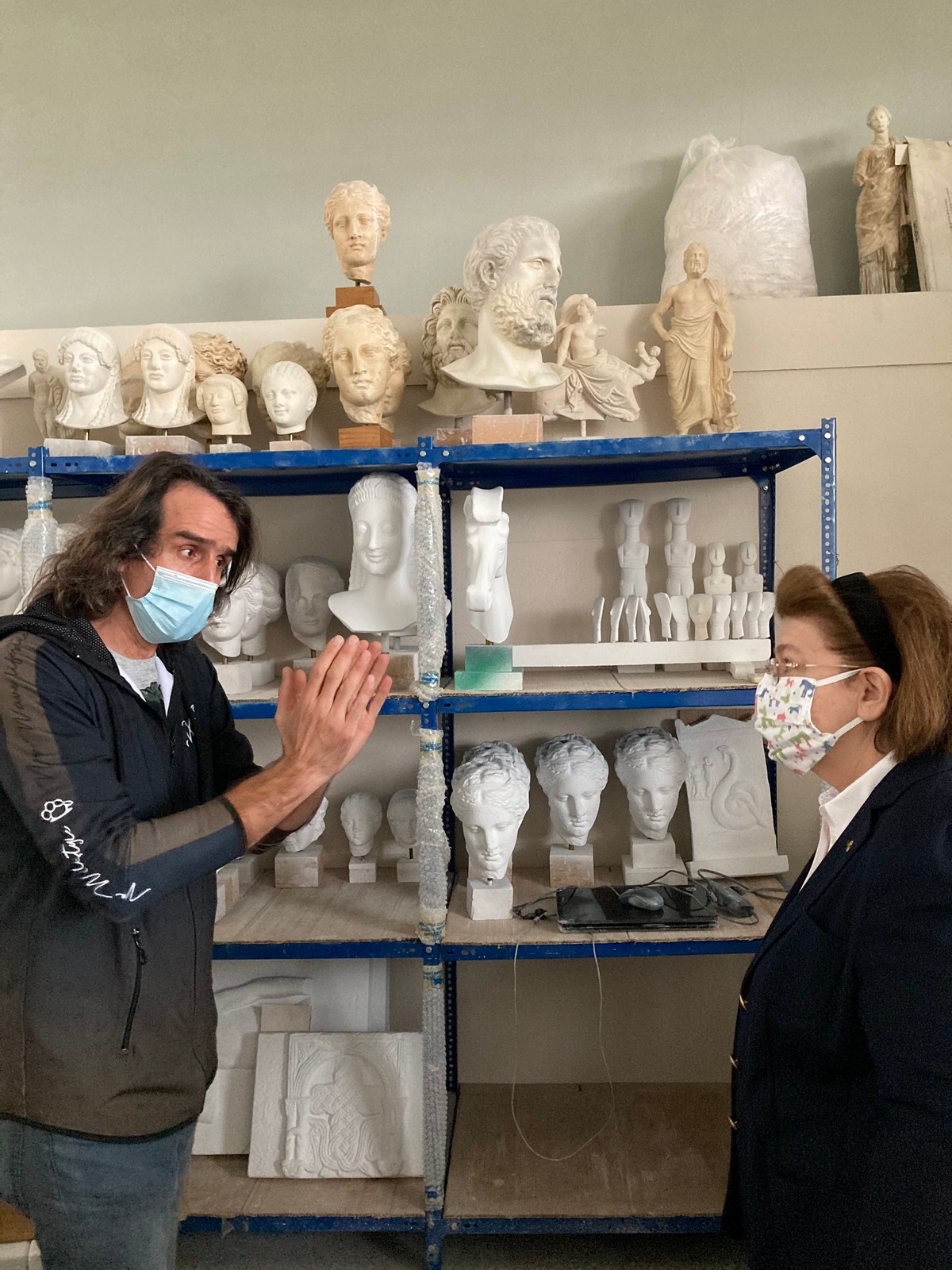 Κατά την επίσκεψη της Υπουργού στα εργαστήρια έγινε διεξοδική και δημιουργική συζήτηση με τα στελέχη και τους εργαζόμενους στον ΟΔΑΠ για ζητήματα που αφορούν στις νέες συνθήκες εργασίας και προσφοράς, που επιβάλλει η νέα δομή του Οργανισμού, όπως η κτηριακή και η υλικοτεχνική υποδομή του, η άμεση ανάγκη στελέχωσης των εργαστηρίων με εξειδικευμένο προσωπικό, ο εκσυγχρονισμός και ο εμπλουτισμός της παραγωγής των αντιγράφων, των απομιμημάτων, των εμπνευσμένων καλλιτεχνημάτων, αλλά και η δημιουργική επένδυση σε νέας υφής ύλες, στις προκλήσεις της ζήτησης που ήδη καταγράφεται, όχι μόνον στο εσωτερικό, αλλά και από το εξωτερικό.