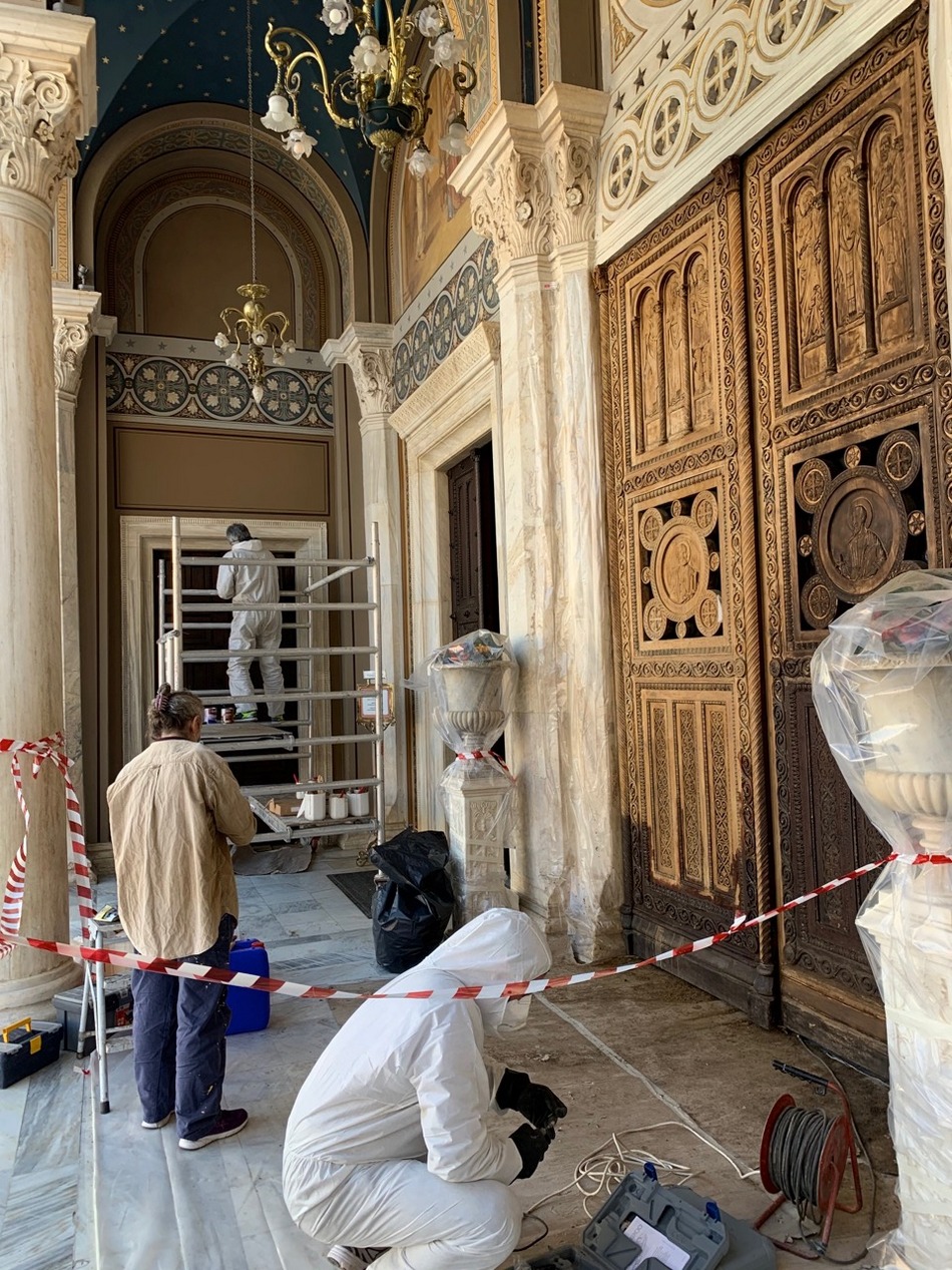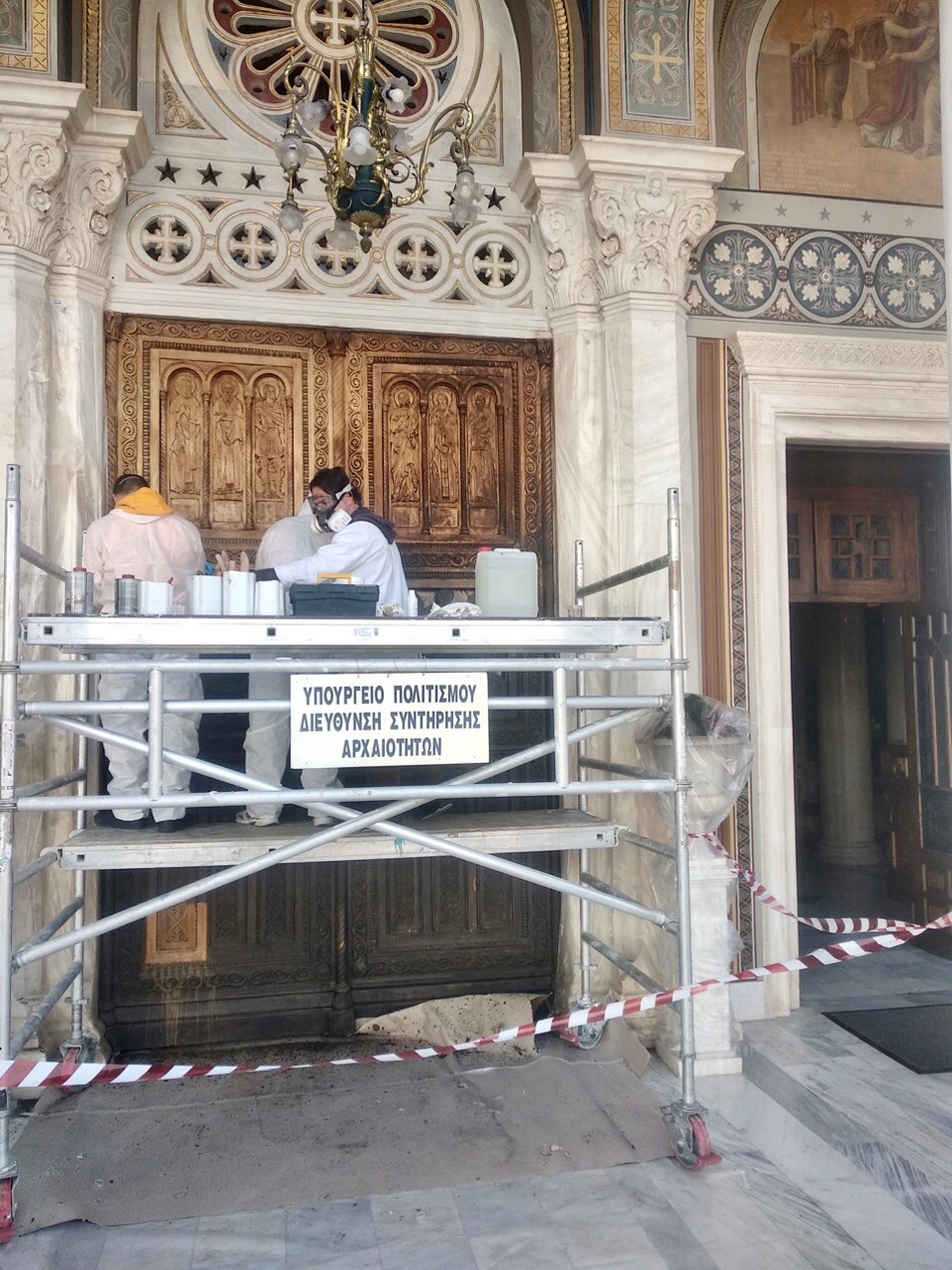 Η περίτεχνη ξύλινη κεντρική πύλη του Μητροπολιτικού Ναού Αθηνών, αφιερωμένου στον Ευαγγελισμό της Θεοτόκου, κοσμείται από ολόσωμες μορφές αγίων και με ανάγλυφα διακοσμητικά μετάλλια. Η πύλη καθώς και οι λοιπές ξύλινες θύρες του ναού έχρηζαν άμεσης επέμβασης συντήρησης.