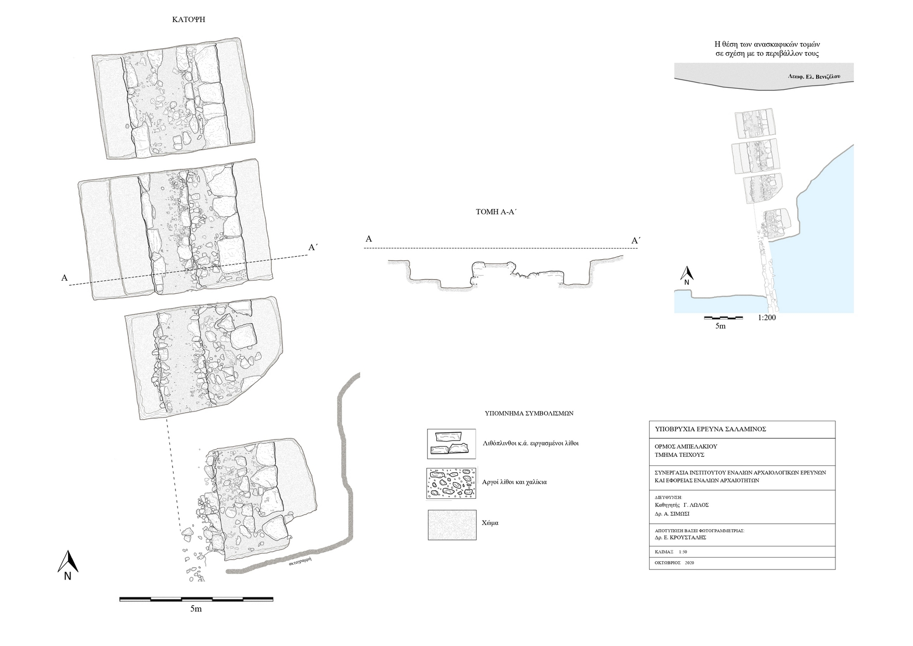 Λόγω της γενικότερης αβεβαιότητας και αδυναμίας προτέρου πλήρους σχεδιασμού, η έρευνα περιορίσθηκε στην βόρεια πλευρά του μυχού του Όρμου του Αμπελακίου, όπου ερευνώνται, από το 2016, καταβυθισμένα αρχιτεκτονικά υπολείμματα της αρχαίας πόλης της Σαλαμίνος, με σαφείς συνέχειες στον σημερινό αιγιαλό. Τα αποτελέσματα της έρευνας του 2020 κρίνονται ιδιαιτέρως σημαντικά, εφ' όσον διακριβώθηκε οριστικά η πορεία του επιθαλασσίου τείχους της Κλασικής πόλης, παρά τον λιμένα, με την αποκάλυψη μεγάλου σκέλους του.