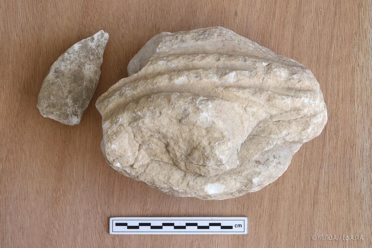 Στα αμέσως υποκείμενα στρώματα του δαπέδου (από πλακάκια) του λυόμενου οικίσκου, ανάμεσα στην επίχωση για την κατασκευή του οικίσκου, εντοπίστηκαν θραύσματα αρχαίων μελών, όπως φαίνεται και στις φωτογραφίες που δημοσιεύσαμε χθες.
