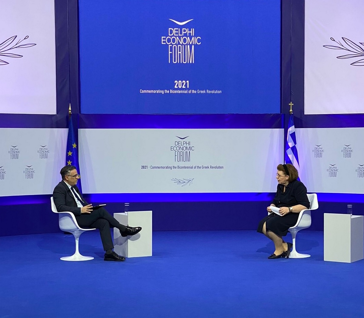 Η Υπουργός Πολιτισμού και Αθλητισμού Λίνα Μενδώνη μίλησε σήμερα το απόγευμα στο Οικονομικό Φόρουμ των Δελφών, σε μια συζήτηση με τον δημοσιογράφο Γιώργο Κουβαρά, με θέμα "Οικονομία των Εμπειριών: Η μεγάλη ευκαιρία για τον Πολιτισμό".