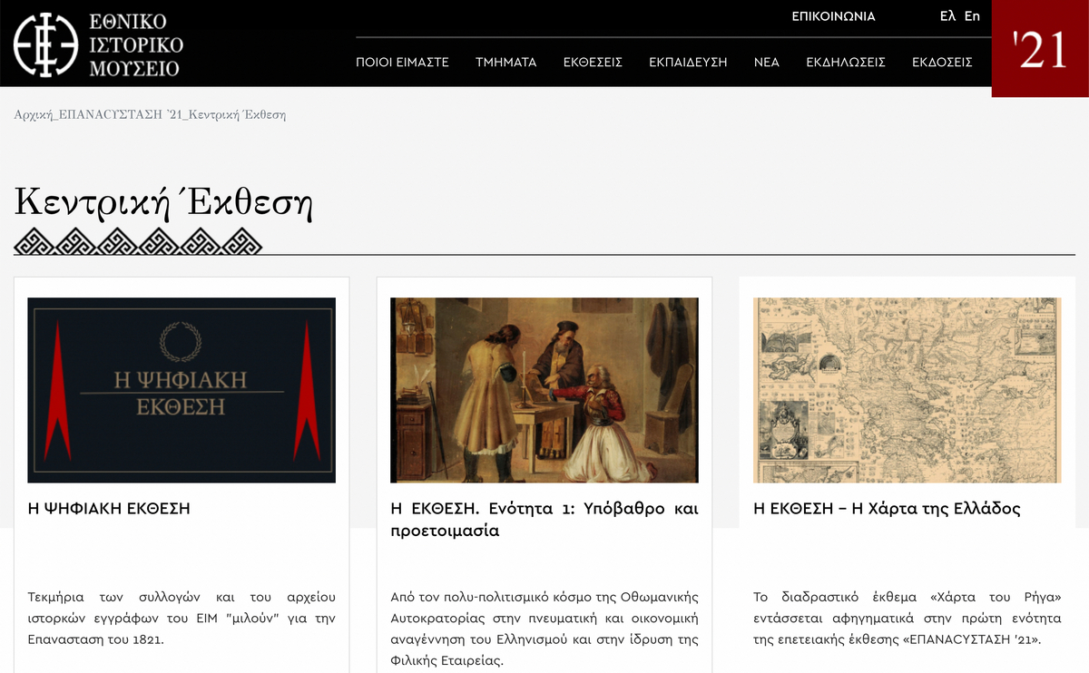 H ψηφιακή ξενάγηση της επετειακής έκθεσης «ΕΠΑΝΑCYΣΤΑΣΗ '21», φωτίζει, μέσα από ιστορίες 80 τεκμηρίων, αθέατες πλευρές της Επανάστασης. Επιπλέον, η 360ο περιήγηση δίνει στον χρήστη την αίσθηση του φυσικού χώρου της έκθεσης. Η ψηφιακή ξενάγηση είναι προσβάσιμη από αύριο μέσω της νέας ιστοσελίδας του Εθνικού Ιστορικού Μουσείου (https://www.nhmuseum.gr/epanacystasi-21/kentriki-ekthesi). Το ΕΙΜ, στο πλαίσιο των εορτασμών της επετείου των 200 χρόνων, με αφορμή τις αυξανόμενες ανάγκες εξ αποστάσεως επικοινωνίας και με στόχο την προσέγγιση ενός διευρυμένου κοινού, έχει επενδύσει στη βελτίωση της ψηφιακής του εικόνας.