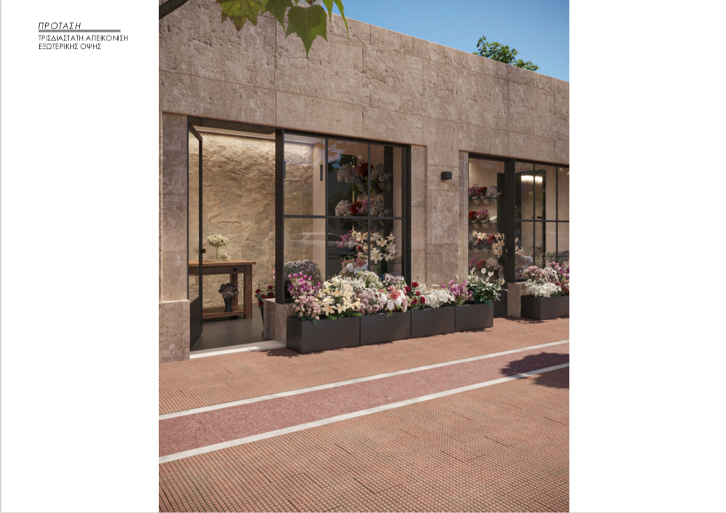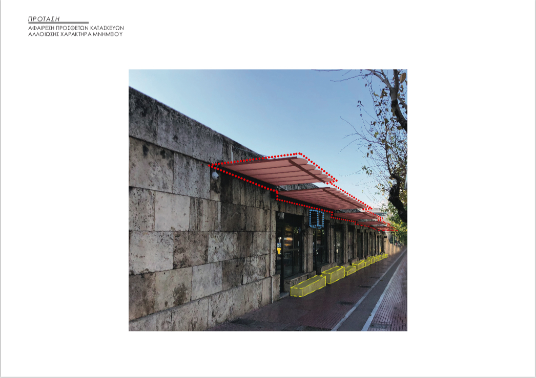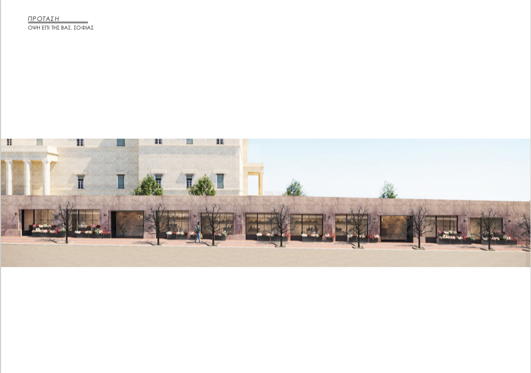 Όπως προβλέπει η αρχιτεκτονική μελέτη, αφαιρούνται οι πρόσθετες εξωτερικές κατασκευές, οι οποίες αλλοιώνουν τον χαρακτήρα του μνημείου και εκσυγχρονίζεται η κύρια όψη επί της λεωφόρου Βασιλίσσης Σοφίας, κατά μήκος των καταστημάτων. Διατηρούνται δύο ανθοπωλεία, στα δύο άκρα των καταστημάτων και προστίθενται Εκθετήρια της Βουλής και του ΟΔΑΠ και βοηθητικοί χώροι εξυπηρέτησης. Τα καταστήματα που θα λειτουργήσουν ως Εκθετήρια, θα ενοποιηθούν με εσωτερικές διανοίξεις των εσωτερικών τοιχίων και διαδρόμους. Επιπλέον, δημιουργούνται ημιυπαίθριοι χώροι, στους οποίους και θα μπορούν να φιλοξενούνται περιοδικές εκθέσεις.