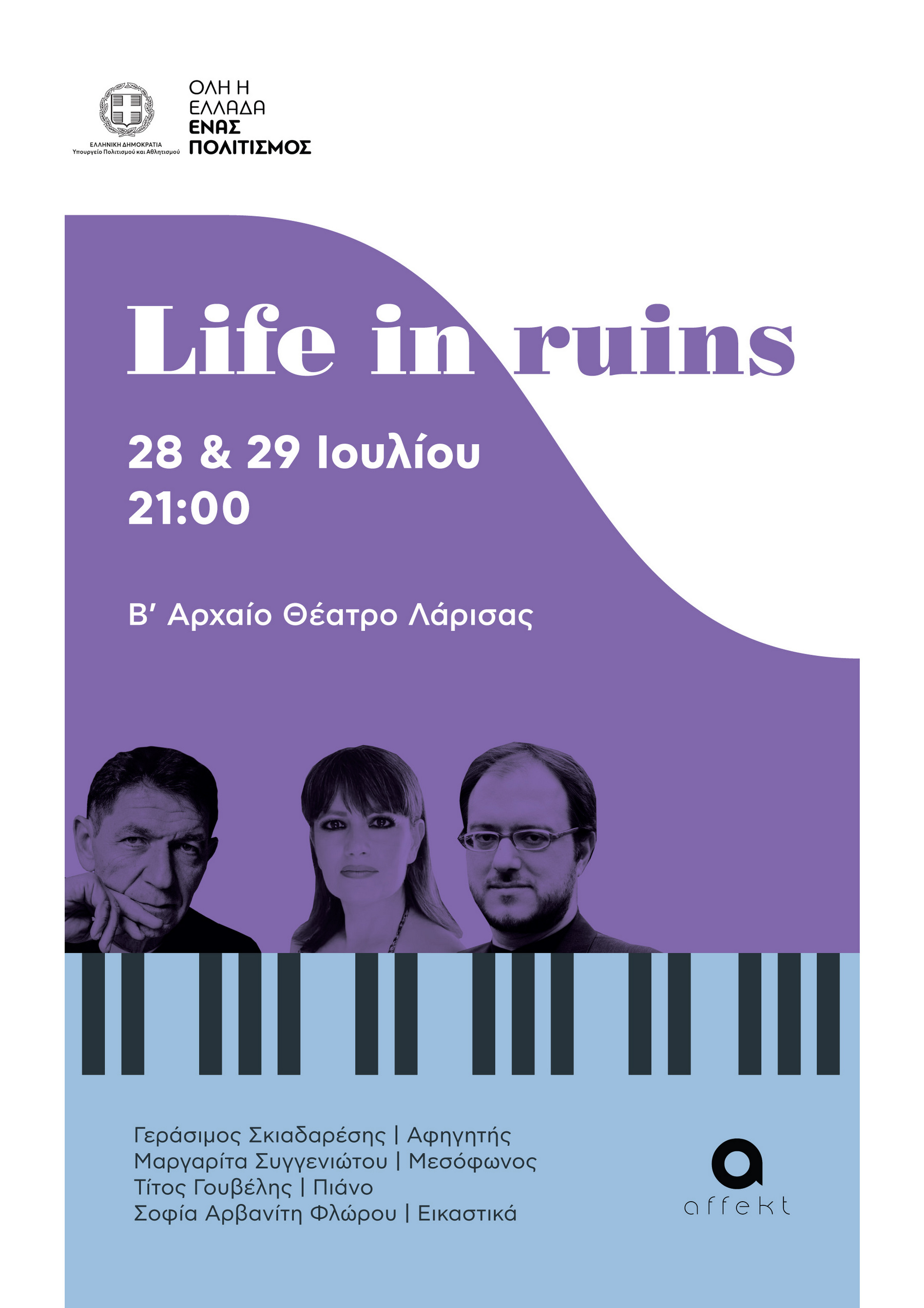 Ο ηθοποιός Γεράσιμος Σκιαδαρέσης, η μεσόφωνος Μαργαρίτα Συγγενιώτου, ο πιανίστας Τίτος Γουβέλης και η εικαστικός Σοφία Φλώρου Αρβανίτη αφηγούνται ορισμένες από τις κομβικότερες στιγμές του ανθρώπινου πολιτισμού (π.χ. Β' Παγκόσμιος, Μεγάλος Πόλεμος, Πανδημίες κα.) στο Β Αρχαίο Θέατρο Λάρισας- υπόμνηση του μεγαλείου αλλά και της θνητότητας του ανθρώπινου γένους.
