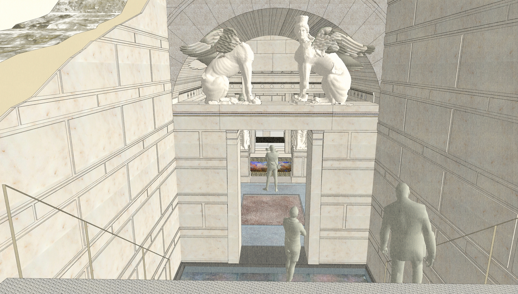 Στο εσωτερικό του μνημείου, διαμορφώνονται υπερυψωμένα δάπεδα πρόσβασης με βαθμίδες, τα οποία οδηγούν στο γυάλινο δάπεδο, που θα καλύπτει το βοτσαλωτό του Χώρου 1, ενώ στον Χώρο 2, θα κατασκευαστεί περιμετρικός διάδρομος με γυάλινο δάπεδο για την θέαση των Καρυάτιδων και του τρίτου χώρου, όπου βρίσκεται το ψηφιδωτό της «Αρπαγής της Περσεφόνης».