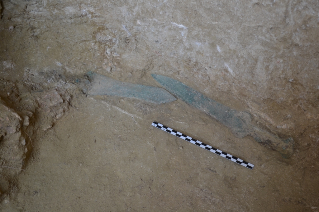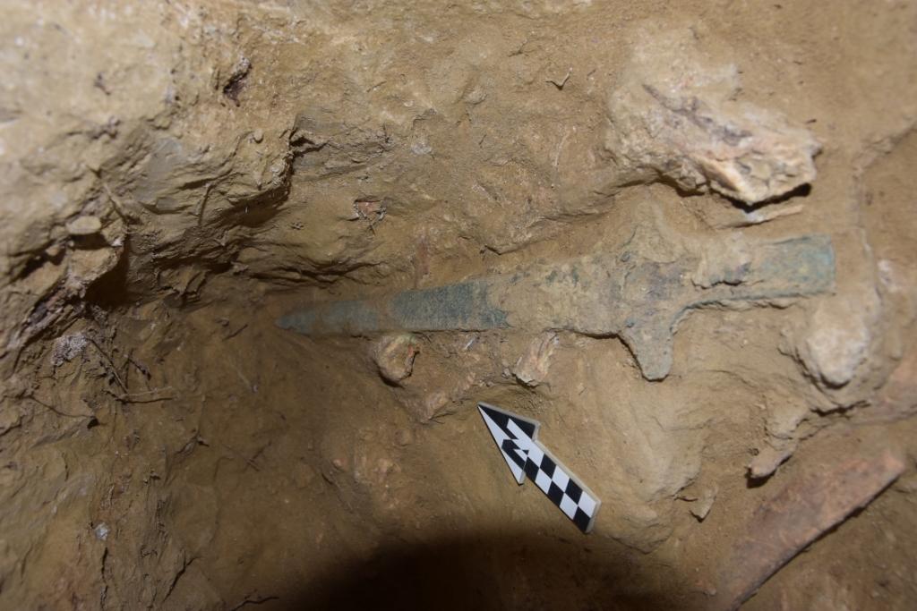 Μεταξύ των οστών και των κτερισμάτων που συνόδευαν αυτές τις παλαιότερες ταφές, χάντρες από γυαλί και κορναλίνη, πήλινο ειδώλιο αλόγου, είχε τοποθετηθεί και ένα εξαιρετικής διατήρησης χάλκινο ξίφος. Στη βάση του σωρού των οστών, βρέθηκαν, επίσης, τοποθετημένα δύο ακόμη ακέραια χάλκινα ξίφη, τα οποία σώζουν και μέρος των ξύλινων λαβών τους. Τα τρία ξίφη ανήκουν σε διαφορετικούς τύπους, Sandars D και Ε, και χρονολογούνται στην περίοδο ακμής της ανακτορικής περιόδου του μυκηναϊκού κόσμου. Η παρουσία αυτών των όπλων, όπως και οι μακρές λόγχες της ίδιας χρονολογικής περιόδου που βρέθηκαν κατά την ανασκαφή σε όμορους τάφους στη νεκρόπολη της Τραπεζάς, είναι ιδιαίτερα σημαντική. Τη διακρίνουν από τις άλλες νεκροπόλεις της Αχαΐας υπογραμμίζοντας την άμεση εξάρτηση της τοπικής κοινωνίας από τα ισχυρά ανακτορικά κέντρα. Τα όπλα αποτελούν προϊόντα των ανακτορικών εργαστηρίων, ίσως των Μυκηνών, συνάδοντας έτσι με το Έπος και τη μυθολογική παράδοση που μας παραδίδεται. Σύμφωνα με αυτή, η Αχαΐα ανήκε στο βασίλειο του Αγαμέμνονα και ο άνακτας των Μυκηνών συγκέντρωσε στο γειτονικό Αίγιο τους αξιολογότερους άνδρες προκειμένου να συσκεφθούν με ποιόν τρόπο πρέπει να γίνει η εκστρατεία εναντίον του κράτους το Πριάμου.