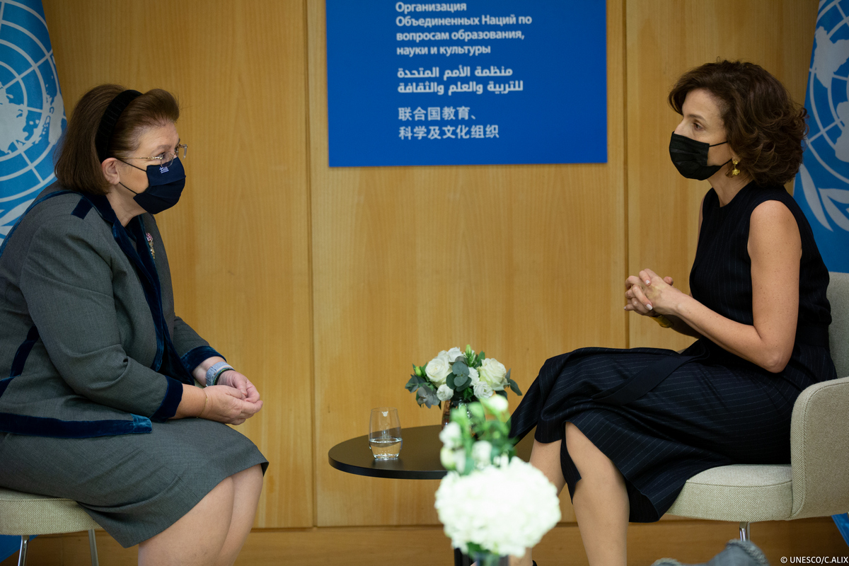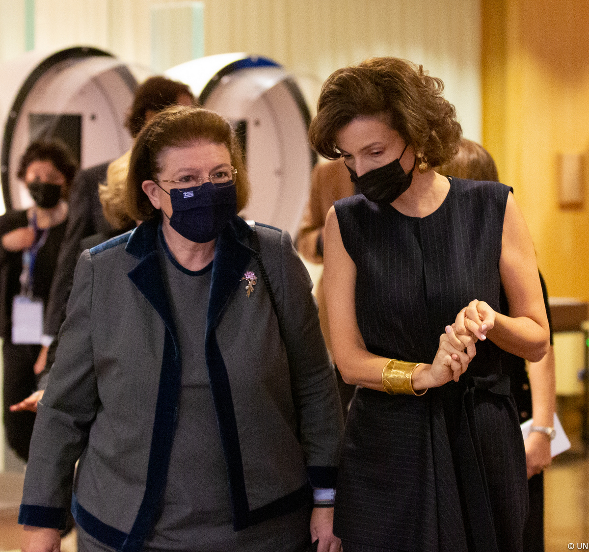 Πριν από την τελετή της απονομής, η Λίνα Μενδώνη και η Audrey Azoulay είχαν κατ΄ιδίαν συνάντηση -παρουσία της Μόνιμης Αντιπροσώπου της Ελλάδας στην UNESCO πρέσβεως Μαρίας Διαμαντοπούλου.