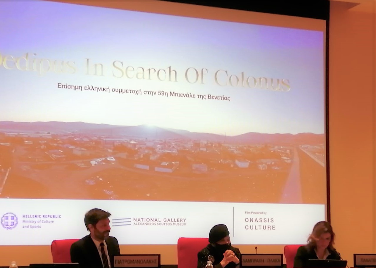 Με το έργο της Λουκίας Αλαβάνου, Στον δρόμο για τον Κολωνό, η ελληνική συμμετοχή στην 59η Μπιενάλε της Βενετίας, προσεγγίζει το θέμα του εκτοπισμού/μετακίνησης και της ταυτότητας μέσα από ένα άλλο πρίσμα, εκείνο της κοινότητας των Ρομά. Η καλλιτέχνις, που συνεργάστηκε στενά με την κοινότητα των Ρομά στην περιοχή του Ασπρόπυργου, δημιουργεί, χρησιμοποιώντας τεχνολογία εικονικής πραγματικότητας 360 μοιρών, ένα έργο καινοτόμο τεχνολογικά χωρίς όμως να χάνει τον βαθιά ανθρωπιστικό του χαρακτήρα, ενώ παράλληλα φέρνει κοντά τον μύθο του Οιδίποδα στη σύγχρονη πραγματικότητα. Ταυτόχρονα, αντλώντας έμπνευση από την δουλειά του οραματιστή αρχιτέκτονα Τάκη Ζενέτου, η καλλιτέχνις, οι επιμελητές και οι αρχιτέκτονες της έκθεσης μετατρέπουν το ελληνικό περίπτερο σε έναν ξεχωριστό χώρο πειραματισμού και διερεύνησης του ρόλου της αρχιτεκτονικής και των νέων τεχνολογιών στη δημόσια θέαση του έργου τέχνης.