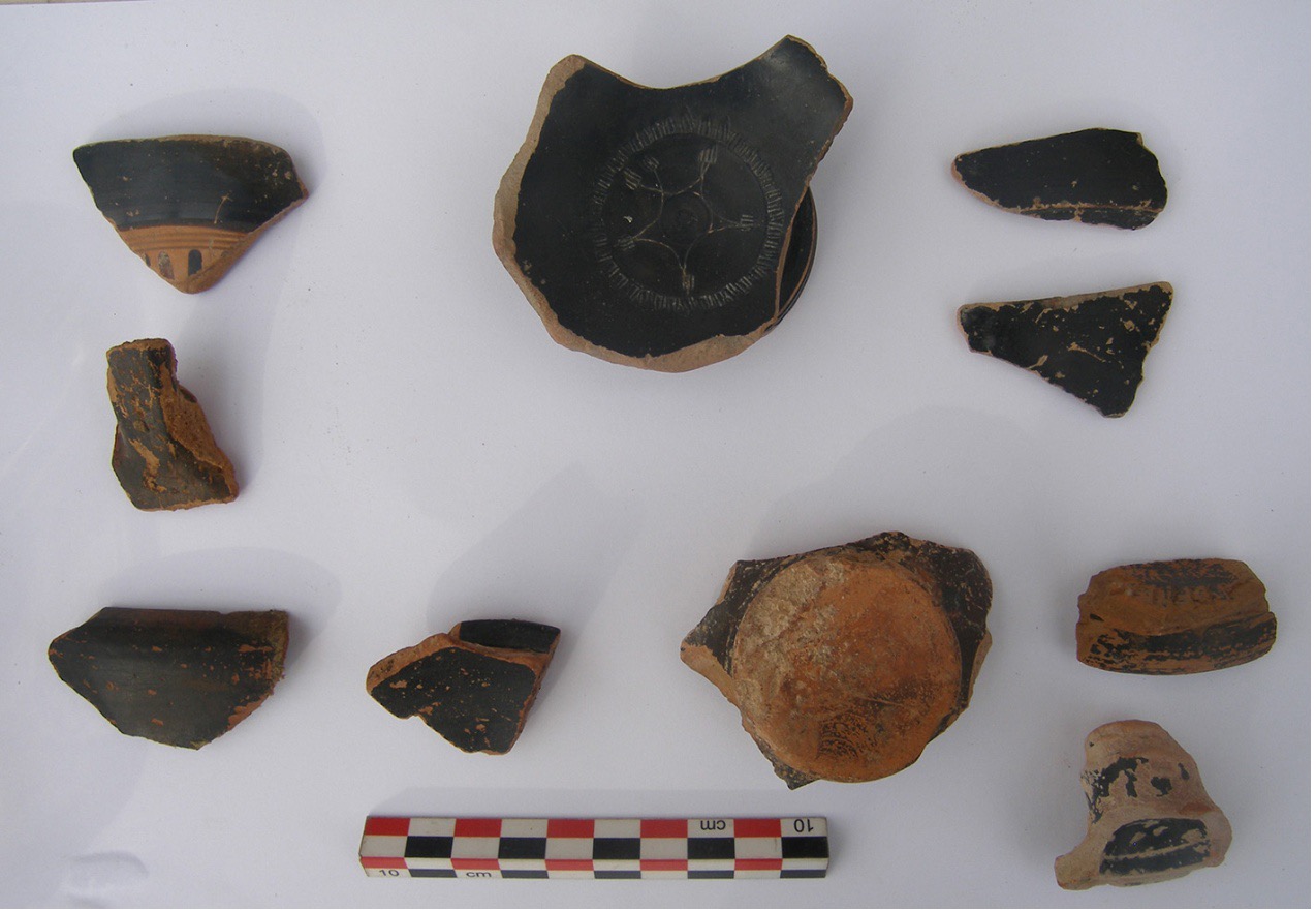 Από την τελευταία ανασκαφή προήλθε σημαντική ποσότητα σωρευμένης ανάμεικτης κεραμεικής (οστράκων αγγείων και κεράμων) των ιστορικών, κυρίως των Ελληνιστικών-Ρωμαϊκών, αλλά και μεταγενεστέρων χρόνων, ενώ μελαμβαφής Αττική κεραμεική της Υστεροκλασικής περιόδου σημειώθηκε και στο επίπεδο θεμελίωσης του τείχους. Εντοπίσθηκαν, ακόμη, πήλινα πώματα αμφορέων και λίγα θραύσματα μαρμάρινων αντικειμένων.