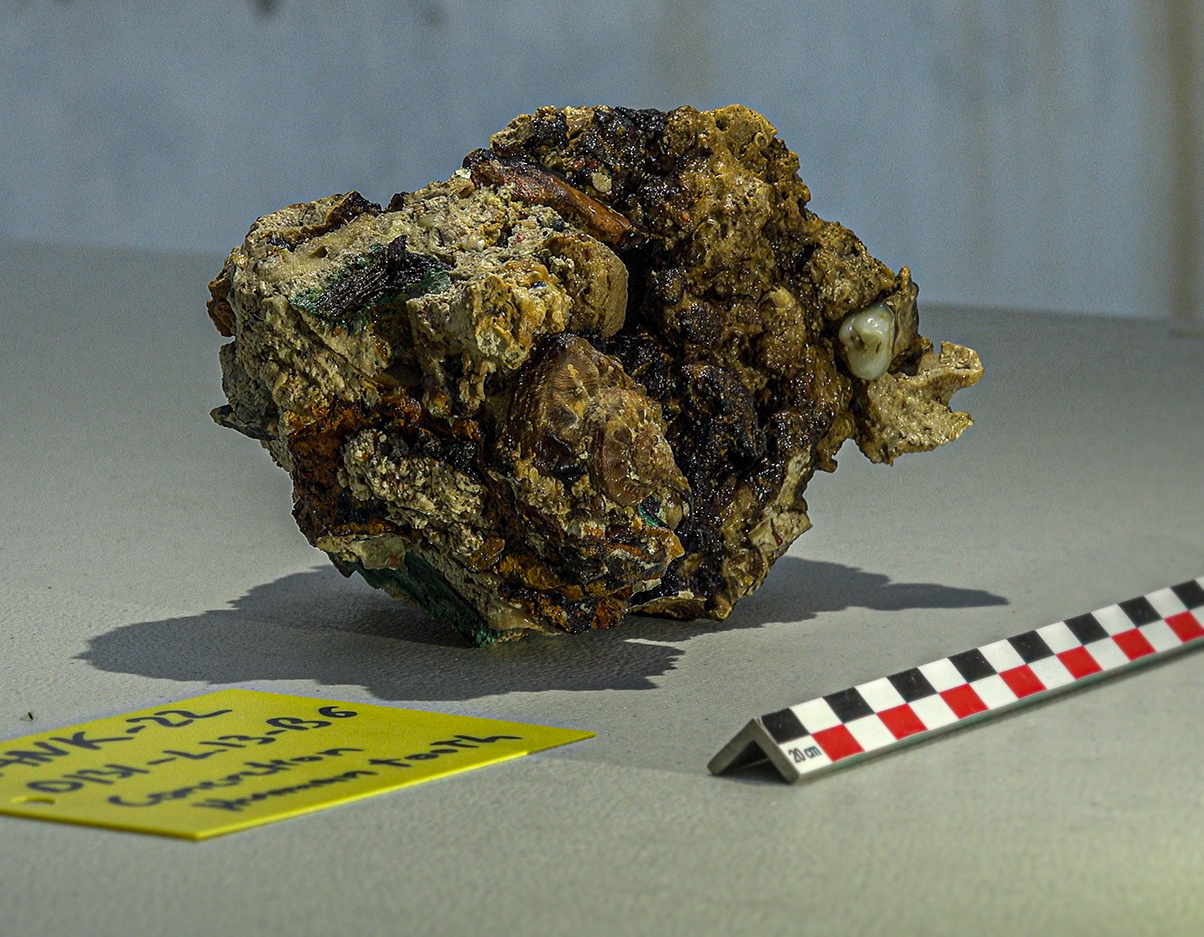 - Η μεγάλη έκπληξη έρχεται από τη ανεύρεση δύο ανθρώπινων δοντιών πάνω σε συμπαγές συσσωμάτωμα με ίχνη χαλκού, το οποίο δια του γενετικού υλικού του θα βοηθήσει στο προσδιορισμό του φύλου και άλλων γενετικών χαρακτηριστικών του ανθρώπου, στον οποίο ανήκαν.