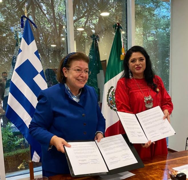 Μνημόνιο Κατανόησης μεταξύ της Ελληνικής Δημοκρατίας και των Ηνωμένων Πολιτειών του Μεξικού στον τομέα του Πολιτισμού υπέγραψαν η Υπουργός Πολιτισμού και Αθλητισμού Λίνα Μενδώνη και η Υπουργός Πολιτισμού του Μεξικού Alejandra Frausto Guerrero.