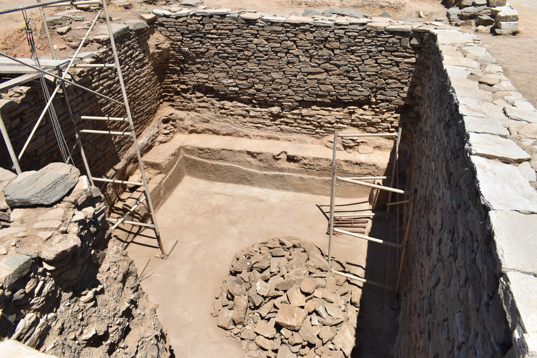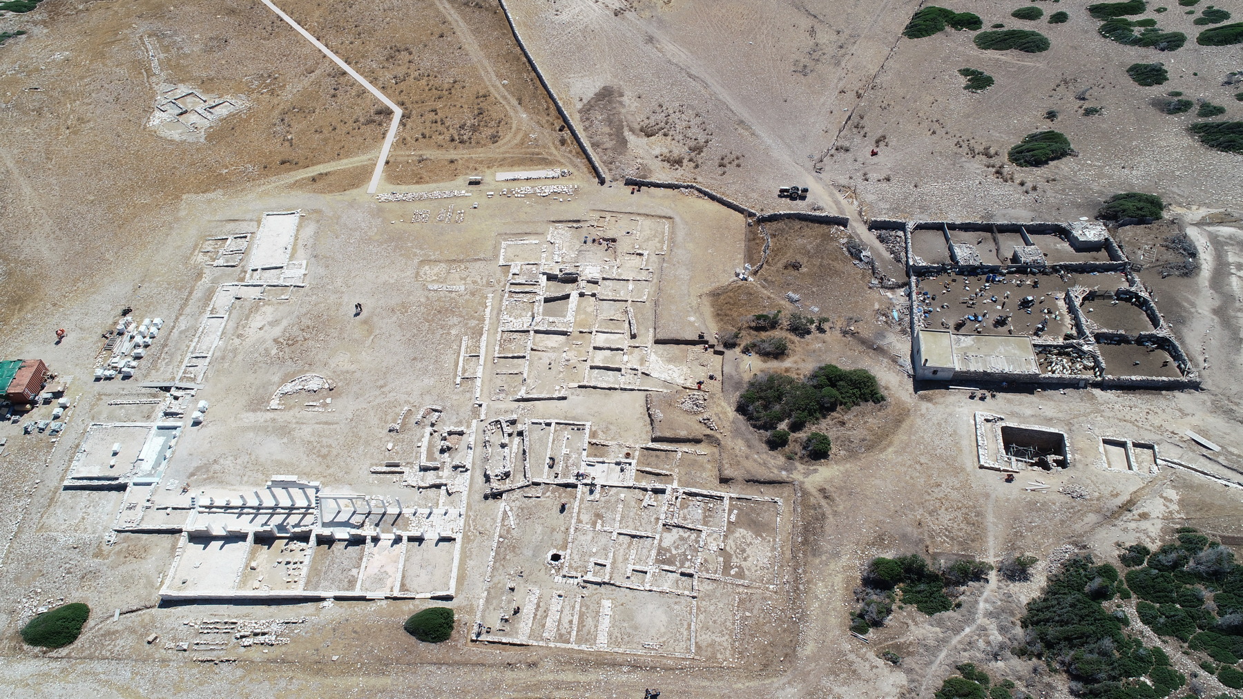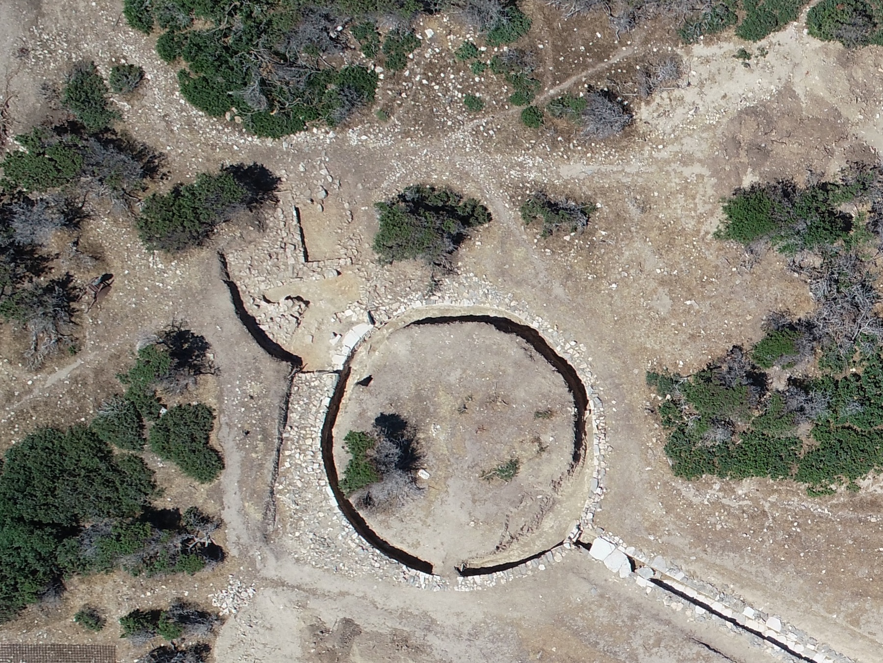 Ανασκαφή: Οι φετινές ανασκαφικές εργασίες επικεντρώθηκαν στο σύστημα των δεξαμενών καθώς και στην περιοχή νότια του τεμένους, στο Ανατολικό Συγκρότημα και στο Κτίριο Π. Συγκεκριμένα, συνεχίστηκε η ανασκαφή της κεντρικής (Δεξαμενή 1), αλλά και της νοτιότερης κυκλικής δεξαμενής (Δεξαμενή 3). Με βάση τα σωζόμενα αρχιτεκτονικά κατάλοιπα μπορούν να διακριθούν τουλάχιστον δύο αρχιτεκτονικές φάσεις της κεντρικής δεξαμενής κατά την αρχαιότητα. Αρχικά, είχε ορθογώνια κάτοψη με εσωτερικές διαστάσεις 5,50 x 7 μ., βάθος περί τα 4 μ. και χωρητικότητα 154 κυβικά μέτρα. Ενώ πέρσι είχαν αποκαλυφθεί πλήρως μόνο ο νότιος και ανατολικός τοίχος, φέτος – μετά από ιδιαίτερα επίπονη και απαιτητική εργασία – αποκαλύφθηκαν σε όλο το μήκος και ύψος τους ο βόρειος και ο δυτικός τοίχος της αρχικής φάσης της. Όλοι οι τοίχοι είναι ιδιαίτερα ισχυροί με πλάτος 0,70-0,80 μ. Για την κατασκευή τους θα πρέπει να αξιοποιήθηκε το φυσικό ανάγλυφο και κάποια υπάρχουσα φυσική κοιλότητα. Η θεμελίωσή τους ύψους 0,40 μ. είναι ιδιαίτερα ισχυρή και εξέχει της ανωδομής περίπου 0,10 μ. αποτελούμενη από μεγάλες πλάκες γνευσίου μήκους 0,50-0,80 μ. Το ανώτερο τμήμα των τοίχων είναι κτισμένο με ορθογωνισμένους λίθους γνευσίου πάχους 0,10-0,15 μ. και μήκους 0,20-0,30 μ. Η δόμησή είναι ιδιαίτερα προσεγμένη με ελάχιστα κενά στους αρμούς μεταξύ των λίθων. Οι όψεις των λίθων δεν είναι λειασμένες, πιθανότατα σκόπιμα, έτσι ώστε να εφαρμόζει καλύτερα ανάμεσα στους αρμούς το παχύ υδραυλικό κονίαμα υπόλευκου χρώματος που κάλυπτε όλη την επιφάνεια των τοίχων. Με το ίδιο κονίαμα είναι επιστρωμένος και ο πυθμένας της δεξαμενής. Τμήμα του σώζεται σε αρκετά καλή κατάσταση κατά μήκος του ανατολικού και νότιου τοίχου. Μετά την απομάκρυνση λίθων και χώματος που είχαν καταρρεύσει πάνω και μπροστά από το βόρειο και το δυτικό τοίχο ήρθε στο φως μία κατασκευή σχήματος Π, τμήμα της οποίας είχε αποκαλυφθεί το 2021 σε επαφή και κατά μήκος του βόρειου και ανατολικού τοίχου της δεξαμενής. Η βόρεια πλευρά της σώζεται σε ύψος 0,80 μ. και έχει πλάτος 0,60 μ. Αποτελείται από τρεις σειρές ορθογώνιων δόμων με επιμελημένες όψεις που μιμούνται ισοδομικό σύστημα τοιχοποιίας. Στο κατώτερο τμήμα τους σώζουν την επένδυση από κονίαμα. Ίδιας κατασκευής είναι και το ανατολικό και δυτικό τμήμα της που σώζονται σε μικρότερο μήκος. Η άνω επιφάνεια των τριών πλευρών της κατασκευής αποτελείται από επίπεδες πλάκες, στοιχείο που πιθανόν παραπέμπει σε χρήση της κατασκευής ως θρανίο. Συνεχίστηκε η διερεύνηση του εσωτερικού της κυκλικής Δεξαμενή 3 που εντοπίστηκε το 2021. Λόγω του όγκου της επίχωσης, αποφασίστηκε να ανοιχθεί δοκιμαστική τομή πλάτους 0,50 μ. σε επαφή με το εσωτερικό της, ώστε να αποκαλυφθεί η εσωτερική όψη της τοιχοποιίας της. Σε απόσταση σχεδόν 1,5 μ. δυτικά από το νότιο άνοιγμα της και σε ελαφρώς υψηλότερο επίπεδο εντοπίστηκε τμήμα ορθογώνιου, αβαθούς κτίσματος που φαίνεται να διαιρείται σε δύο τμήματα (ανατολικό και δυτικό). Πρόκειται πιθανόν για μικρή δεξαμενή ή προλάκκιο, αλλά χρήζει περαιτέρω διερεύνησης. Στο Ανατολικό Συγκρότημα συνεχίστηκε η διερεύνηση του ΝΔ τμήματος του, όπου είχε ήδη αποκαλυφθεί τμήμα μεγάλου πλακόστρωτου χώρου. Διερευνήθηκε ένα ορθογώνιο δωμάτιο νότια του πλακόστρωτου και κατέστη σαφές ότι οι χώροι του Συγκροτήματος εκτείνονται περαιτέρω νότια και ανατολικά. Σημαντικό βάρος δόθηκε στην ανασκαφή της περιοχής νότια το