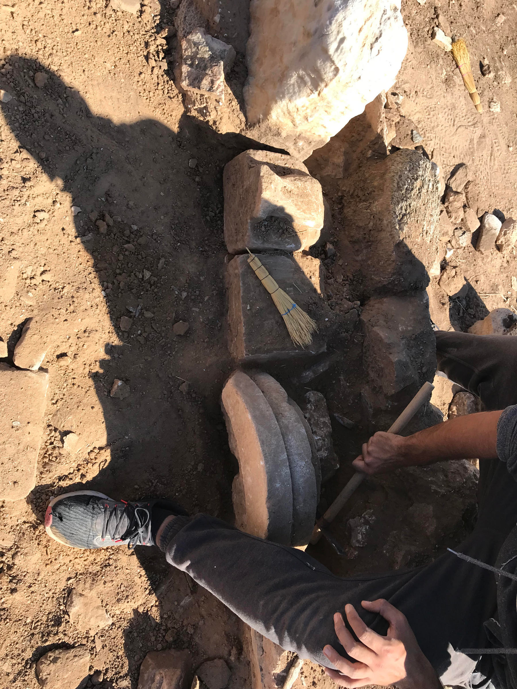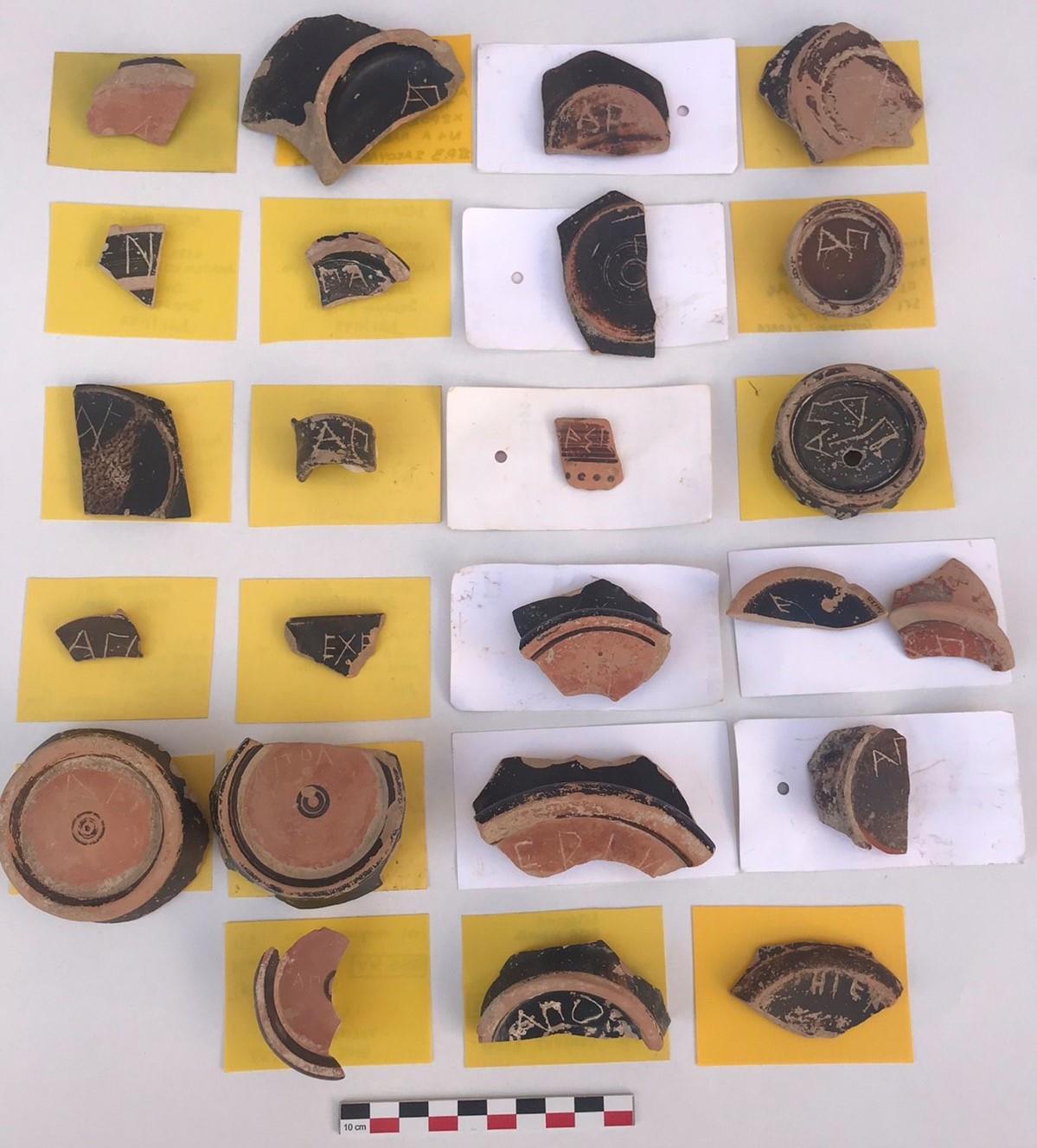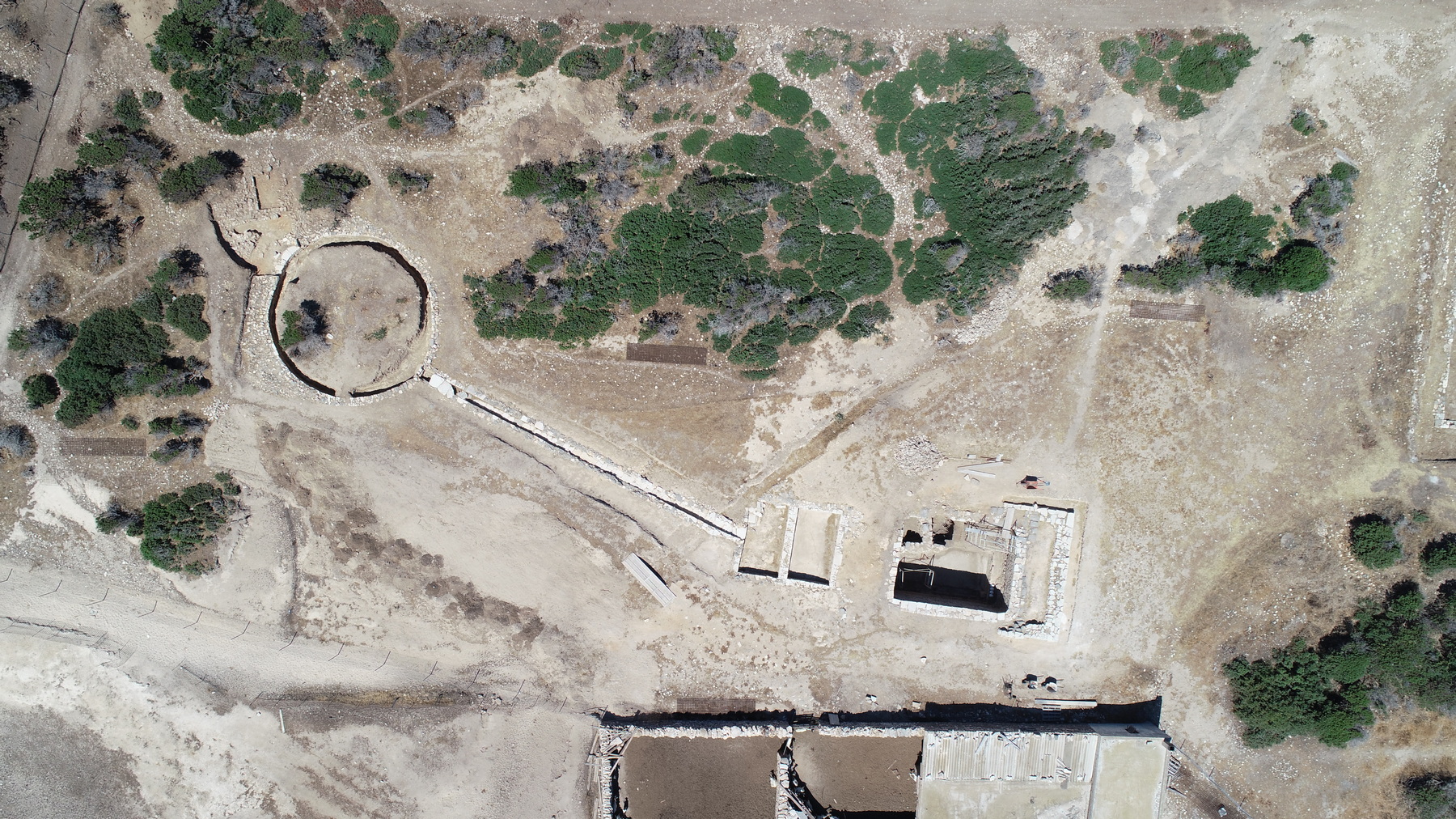 Ανασκαφή: Οι φετινές ανασκαφικές εργασίες επικεντρώθηκαν στο σύστημα των δεξαμενών καθώς και στην περιοχή νότια του τεμένους, στο Ανατολικό Συγκρότημα και στο Κτίριο Π. Συγκεκριμένα, συνεχίστηκε η ανασκαφή της κεντρικής (Δεξαμενή 1), αλλά και της νοτιότερης κυκλικής δεξαμενής (Δεξαμενή 3). Με βάση τα σωζόμενα αρχιτεκτονικά κατάλοιπα μπορούν να διακριθούν τουλάχιστον δύο αρχιτεκτονικές φάσεις της κεντρικής δεξαμενής κατά την αρχαιότητα. Αρχικά, είχε ορθογώνια κάτοψη με εσωτερικές διαστάσεις 5,50 x 7 μ., βάθος περί τα 4 μ. και χωρητικότητα 154 κυβικά μέτρα. Ενώ πέρσι είχαν αποκαλυφθεί πλήρως μόνο ο νότιος και ανατολικός τοίχος, φέτος – μετά από ιδιαίτερα επίπονη και απαιτητική εργασία – αποκαλύφθηκαν σε όλο το μήκος και ύψος τους ο βόρειος και ο δυτικός τοίχος της αρχικής φάσης της. Όλοι οι τοίχοι είναι ιδιαίτερα ισχυροί με πλάτος 0,70-0,80 μ. Για την κατασκευή τους θα πρέπει να αξιοποιήθηκε το φυσικό ανάγλυφο και κάποια υπάρχουσα φυσική κοιλότητα. Η θεμελίωσή τους ύψους 0,40 μ. είναι ιδιαίτερα ισχυρή και εξέχει της ανωδομής περίπου 0,10 μ. αποτελούμενη από μεγάλες πλάκες γνευσίου μήκους 0,50-0,80 μ. Το ανώτερο τμήμα των τοίχων είναι κτισμένο με ορθογωνισμένους λίθους γνευσίου πάχους 0,10-0,15 μ. και μήκους 0,20-0,30 μ. Η δόμησή είναι ιδιαίτερα προσεγμένη με ελάχιστα κενά στους αρμούς μεταξύ των λίθων. Οι όψεις των λίθων δεν είναι λειασμένες, πιθανότατα σκόπιμα, έτσι ώστε να εφαρμόζει καλύτερα ανάμεσα στους αρμούς το παχύ υδραυλικό κονίαμα υπόλευκου χρώματος που κάλυπτε όλη την επιφάνεια των τοίχων. Με το ίδιο κονίαμα είναι επιστρωμένος και ο πυθμένας της δεξαμενής. Τμήμα του σώζεται σε αρκετά καλή κατάσταση κατά μήκος του ανατολικού και νότιου τοίχου. Μετά την απομάκρυνση λίθων και χώματος που είχαν καταρρεύσει πάνω και μπροστά από το βόρειο και το δυτικό τοίχο ήρθε στο φως μία κατασκευή σχήματος Π, τμήμα της οποίας είχε αποκαλυφθεί το 2021 σε επαφή και κατά μήκος του βόρειου και ανατολικού τοίχου της δεξαμενής. Η βόρεια πλευρά της σώζεται σε ύψος 0,80 μ. και έχει πλάτος 0,60 μ. Αποτελείται από τρεις σειρές ορθογώνιων δόμων με επιμελημένες όψεις που μιμούνται ισοδομικό σύστημα τοιχοποιίας. Στο κατώτερο τμήμα τους σώζουν την επένδυση από κονίαμα. Ίδιας κατασκευής είναι και το ανατολικό και δυτικό τμήμα της που σώζονται σε μικρότερο μήκος. Η άνω επιφάνεια των τριών πλευρών της κατασκευής αποτελείται από επίπεδες πλάκες, στοιχείο που πιθανόν παραπέμπει σε χρήση της κατασκευής ως θρανίο. Συνεχίστηκε η διερεύνηση του εσωτερικού της κυκλικής Δεξαμενή 3 που εντοπίστηκε το 2021. Λόγω του όγκου της επίχωσης, αποφασίστηκε να ανοιχθεί δοκιμαστική τομή πλάτους 0,50 μ. σε επαφή με το εσωτερικό της, ώστε να αποκαλυφθεί η εσωτερική όψη της τοιχοποιίας της. Σε απόσταση σχεδόν 1,5 μ. δυτικά από το νότιο άνοιγμα της και σε ελαφρώς υψηλότερο επίπεδο εντοπίστηκε τμήμα ορθογώνιου, αβαθούς κτίσματος που φαίνεται να διαιρείται σε δύο τμήματα (ανατολικό και δυτικό). Πρόκειται πιθανόν για μικρή δεξαμενή ή προλάκκιο, αλλά χρήζει περαιτέρω διερεύνησης. Στο Ανατολικό Συγκρότημα συνεχίστηκε η διερεύνηση του ΝΔ τμήματος του, όπου είχε ήδη αποκαλυφθεί τμήμα μεγάλου πλακόστρωτου χώρου. Διερευνήθηκε ένα ορθογώνιο δωμάτιο νότια του πλακόστρωτου και κατέστη σαφές ότι οι χώροι του Συγκροτήματος εκτείνονται περαιτέρω νότια και ανατολικά. Σημαντικό βάρος δόθηκε στην ανασκαφή της περιοχής νότια το