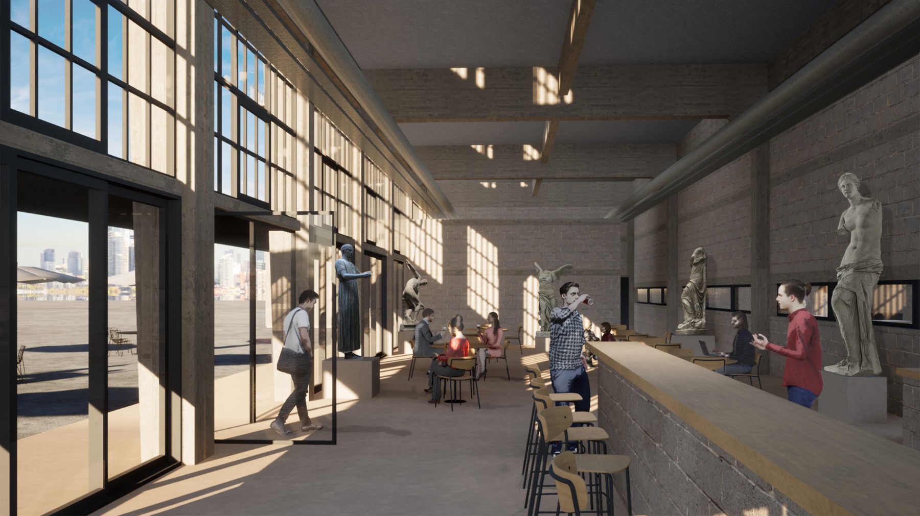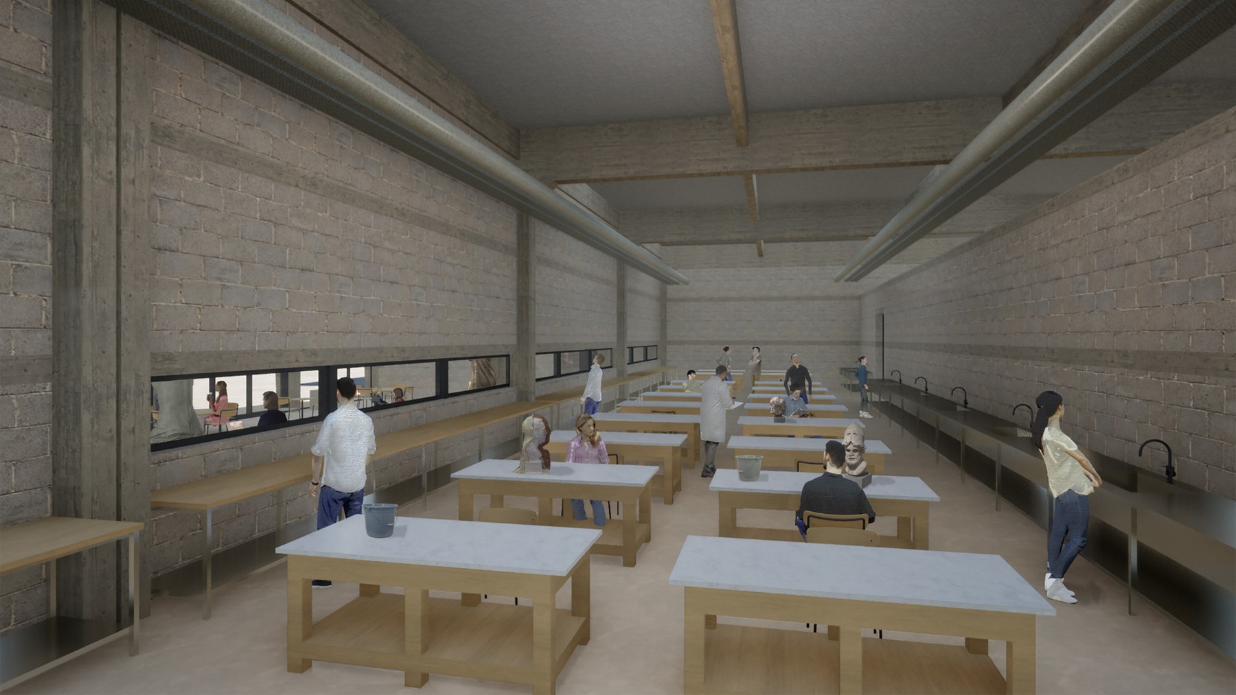 Στόχος της αρχιτεκτονικής μελέτης είναι το κτήριο να διατηρήσει τον αρχικό του χαρακτήρα και τη μορφή του. Στο πλαίσιο αυτό το περίβλημά του συντηρείται και αποκαθίσταται στην αρχική του μορφή σχεδόν στο σύνολό του. Μια πρόκληση που αντιμετωπίζει η μελέτη είναι ο συνδυασμός ετερόκλητων χρήσεων μέσα στο ίδιο κτηριακό κέλυφος και η λειτουργική σύνδεσή τους. Τα εργαστήρια, τα οποία αποτελούν τον πυρήνα του προγράμματος πρέπει να σχετίζονται με τις αποθήκες και τη γλυπτοθήκη-μοντελοθήκη, και συγχρόνως να είναι επισκέψιμα από το κοινό, παράλληλα με τη γλυπτοθήκη. Το πωλητήριο προβλέπεται να είναι προσβάσιμο ανεξάρτητα από τα εκθεσιακά τμήματα και σε άμεση γειτνίαση με το αναψυκτήριο. Ορίζεται κεντρική είσοδος στο κτίριο, ανοίγονται βοηθητικές είσοδοι που εξυπηρετούν τα εργαστήρια και τις αποθήκες και τη δυνατότητα φόρτωσης και εκφόρτωσης αντικειμένων. Ακόμη, σχεδιάζονται νέα κλιμακοστάσια -πέρα του υφιστάμενου- καθώς και έξοδοι διαφυγής από το εσωτερικό του κτηρίου κατευθείαν στον περιβάλλοντα χώρο. Η αντιμετώπιση παθολογιών του κτηρίου τόσο αισθητικών όσο και λειτουργικών, συνίστανται κυρίως στην εγκατάλειψή του για μεγάλο διάστημα.