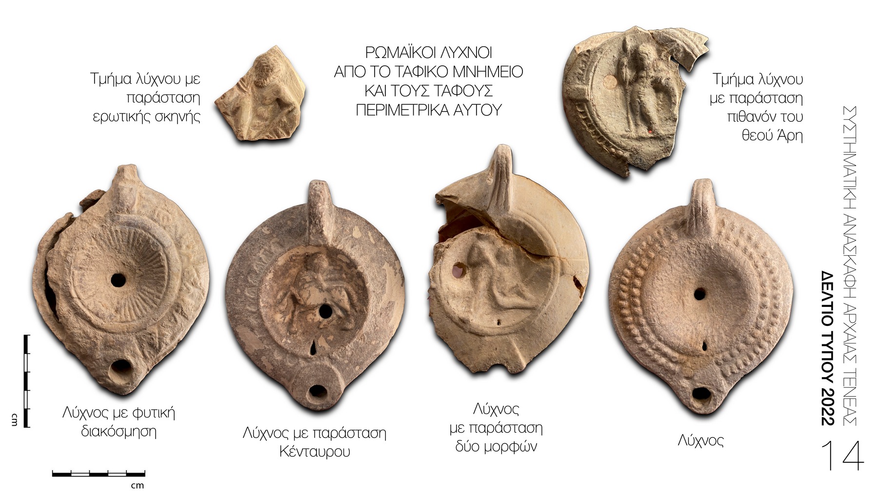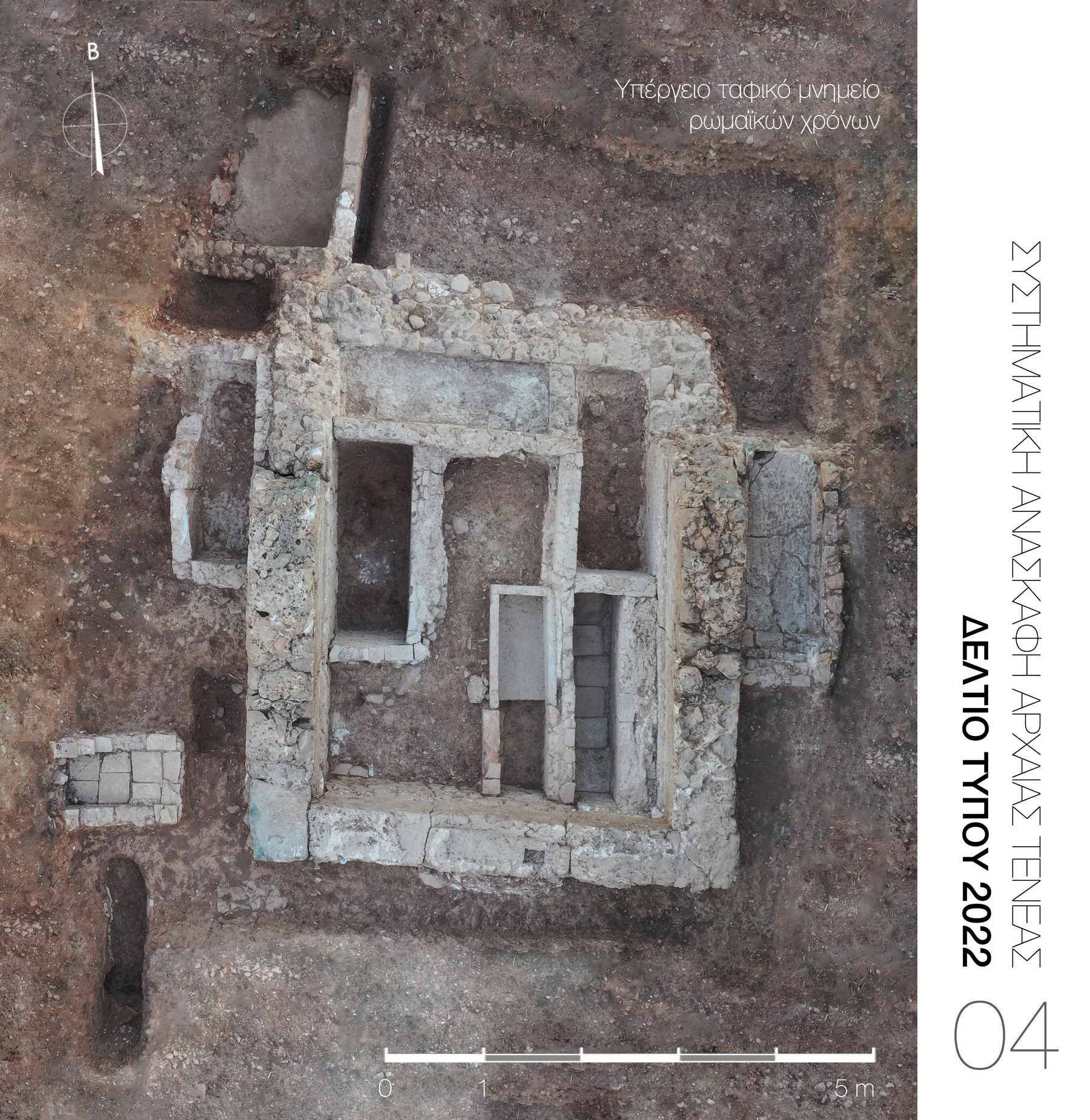 Ανατολικά, στο όριο της ζώνης των νεκροταφείων, αποκαλύφθηκε υπέργειο ταφικό μνημείο ρωμαϊκών χρόνων με υπόγειο ταφικό θάλαμο (Εικ. 4). Το μνημείο έχει διαστάσεις 4,5μ. x 5μ. και προσανατολισμό από Β/Ν με είσοδο στα νότια. Στο εσωτερικό του εντοπίστηκαν περιμετρικά των τοίχων τέσσερις κτιστές θήκες. Σε μεταγενέστερο χρόνο διαμορφώθηκε πέμπτος κτιστός τάφος με τη χρήση τμήματος πώρινης μονολιθικής σαρκοφάγου. Επιπλέον, στη ΝΔ γωνία του θαλάμου βρέθηκε παιδική ταφή σε λακκοειδή καλυβίτη κεραμοσκεπή τάφο. Μεταξύ των ευρημάτων από τους ανωτέρω τάφους ξεχωρίζουν περίαπτο με τρία χάλκινα ασσάρια κοπής Ρώμης, θησαυρός από τρεις χάλκινες «μάρκες», νόμισμα κοπής Κορίνθου του 1ου αι. π.Χ., χάλκινο νόμισμα κοπής Αθήνας κλασικών χρόνων, λύχνος με παράσταση του θεού Άρη, γυάλινο μυροδοχείο, τεφροδόχο αγγείο, κύπελλο και ένας λύχνος του 5ου αι. π.Χ. (Εικ 14,15)