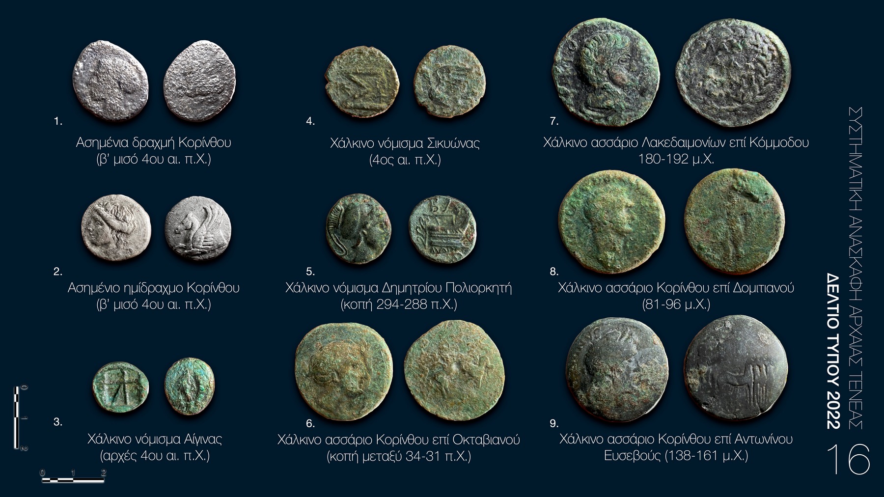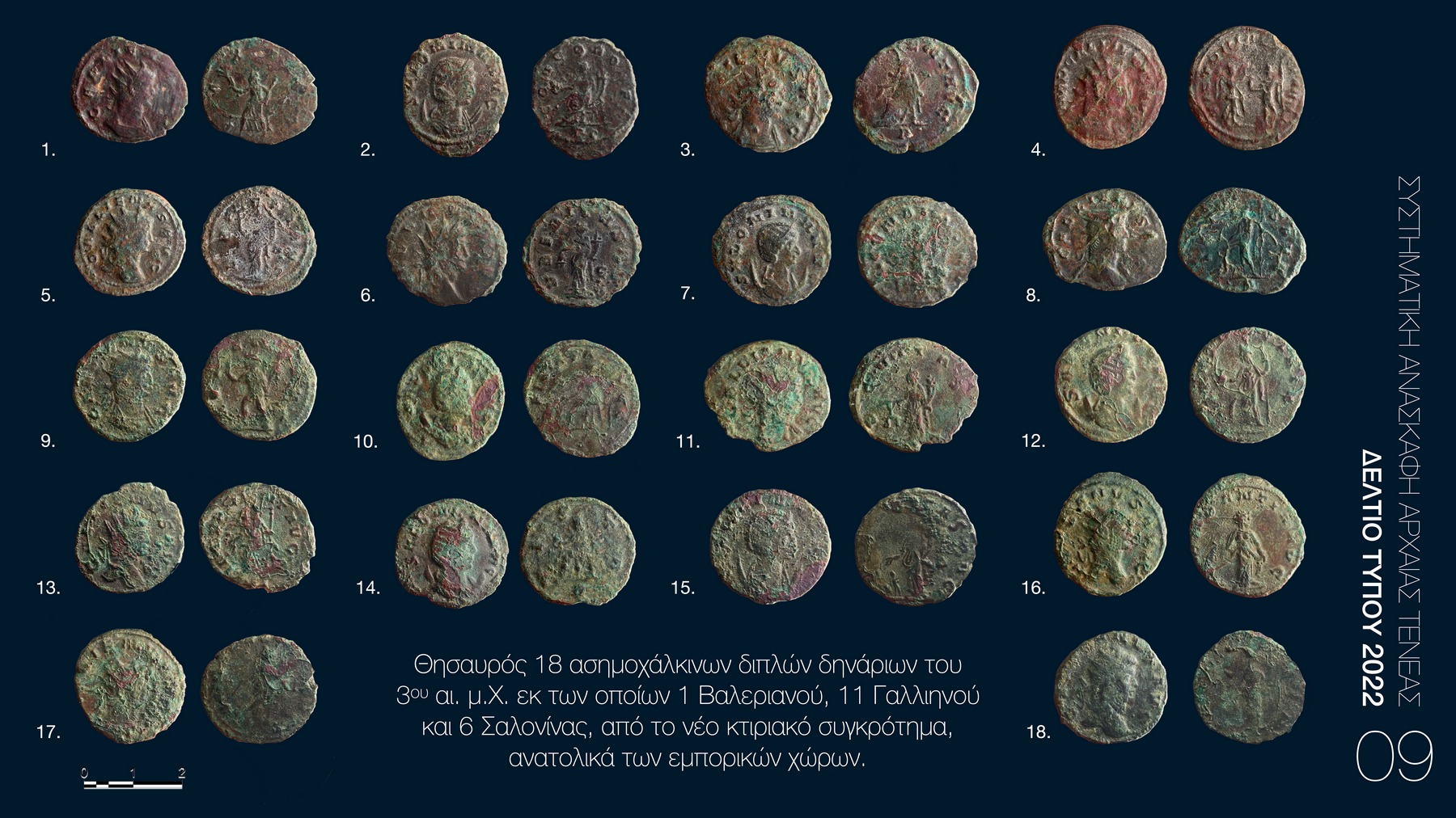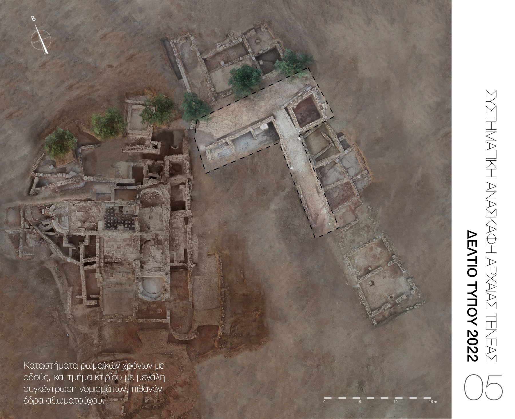 Το μέγεθος και η δυναμική της ρωμαϊκής πόλης συνεχίζει να εντυπωσιάζει και με τα φετινά ανασκαφικά αποτελέσματα. Στον τομέα των ρωμαϊκών καταστημάτων της πόλης αποκαλύφθηκαν περί τα 2100 νομίσματα και σταθμία σε ένα δωμάτιο του κτιρίου, που ταυτίζεται με την έδρα τοπικού αξιωματούχου (Εικ. 5). Επιπλέον, ήρθε στο φως δεύτερο υπέργειο ταφικό μνημείο (Εικ. 4) που καταδεικνύει, σε συνδυασμό με το πρώτο που εντοπίστηκε το 2016, την οικονομική ευρωστία και ακμή της ρωμαϊκής Τενέας. Τέλος, ανασκάφηκε μια υπερμεγέθης δεξαμενή περίπου 130 τ.μ., πιθανότατα η κεντρική υδροδοτική της ρωμαϊκής πόλης (Εικ. 3), που δείχνει τη δυναμική του πληθυσμού της τη συγκεκριμένη περίοδο.