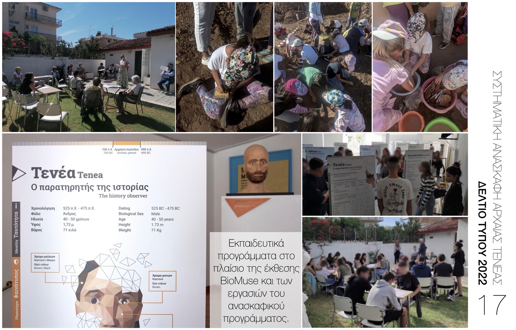 Το ερευνητικό πρόγραμμα της αρχαίας Τενέας κατά τη φετινή ανασκαφική περίοδο δραστηριοποιήθηκε, πέραν της αρχαιολογικής έρευνας, συνδιοργανώνοντας με το Εργαστήριο Φυσικής Ανθρωπολογίας του Δημοκριτείου Πανεπιστημίου Θράκης, την Tetragon A.E., το Δήμο Κορινθίων και το Καλογεροπούλειο Ίδρυμα την περιοδική έκθεση BioMuse «Από τα θραύσματα των οστών στις ιστορίες των ανθρώπων», που φιλοξενήθηκε στο Καλογεροπούλειο Ίδρυμα Κορίνθου από τις 17 Σεπτεμβρίου έως τις 17 Οκτωβρίου. έκθεση υλοποιήθηκε σε συνέχεια του ερευνητικού προγράμματος BioΜuse, μια σύμπραξη φορέων της Ελλάδας και της Γερμανίας και παρουσιάζει με σύγχρονα φυσικά και ψηφιακά μέσα τις βιογραφίες δέκα ανθρώπων που έζησαν στην Ελλάδα τα τελευταία 11.000 χρόνια- μεταξύ αυτών και ενός Τενεάτη αρχαϊκών χρόνων (Εικ. 17).