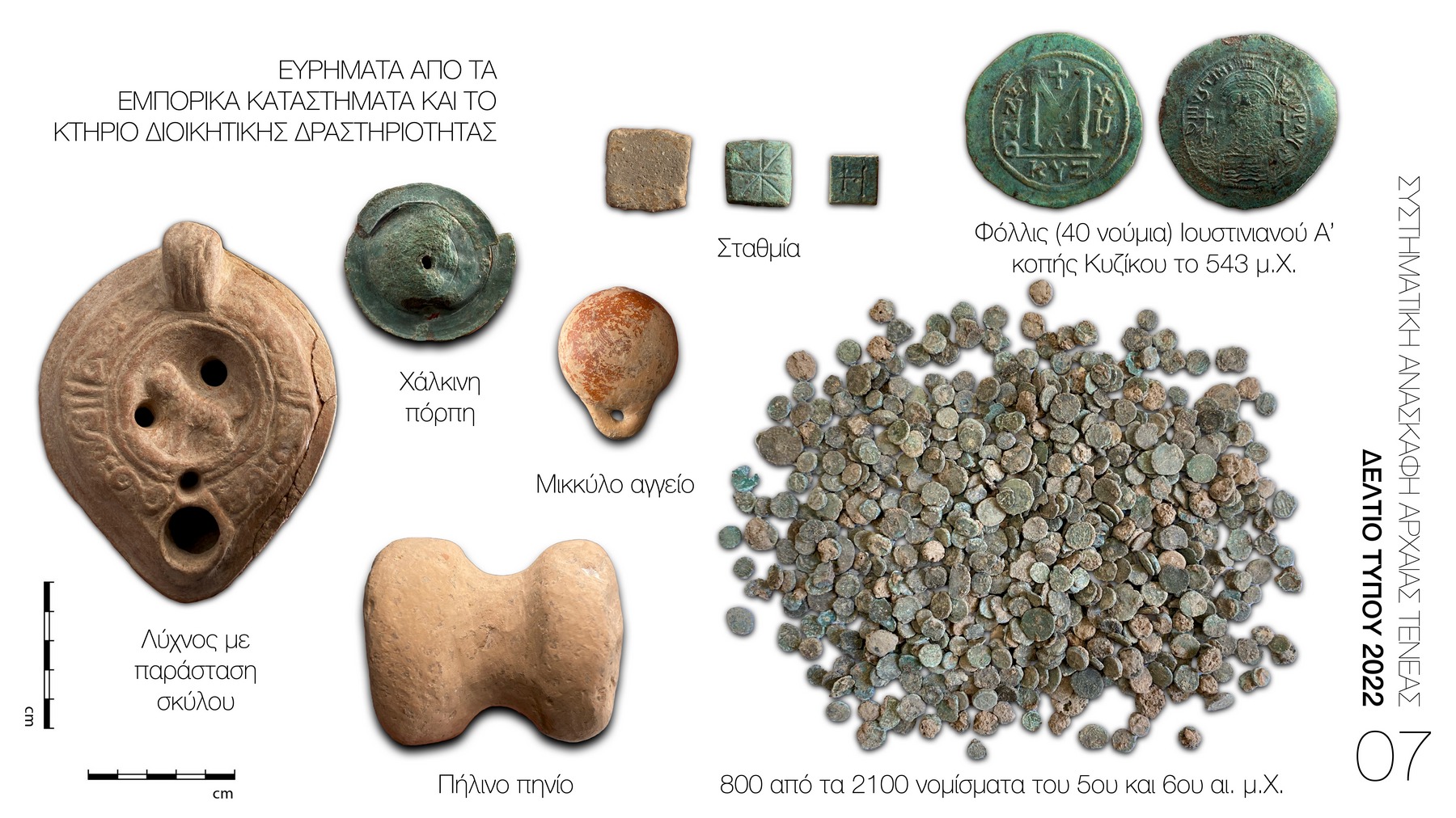 Στη διασταύρωση, που διαμορφώνεται μεταξύ του κεντρικού λιθόστρωτου δρόμου και της παρόδου, ανασκάφηκε νέο δωμάτιο εσωτερικών διαστάσεων περίπου 3,90μ. x 4,30μ. Στον χώρο που διερευνήθηκε φέτος εντοπίστηκαν στο ίδιο στρώμα καταστροφής 2100 νομίσματα του 5ου και 6ου αι. μ.Χ. (Εικ. 7). Μεταξύ αυτών ξεχωρίζουν τα: φόλλις της Κυζίκου του 543 μ.Χ., νούμια των Θεοδοσίου, Μαρκιανού, Λέοντα Α΄, Ζήνωνα, Αναστάσιου, Ιουστίνου Α΄ και Ιουστινιανού Α΄ (Εικ. 7), καθώς επίσης και χάλκινο νόμισμα κοπής Αίγινας του 4ου αι. π.Χ. (Εικ. 16.3). Πέραν των νομισμάτων εντοπίστηκαν ένα μολύβδινο και δύο χάλκινα σταθμία, καθώς και μία χάλκινη βελόνα (Εικ. 7).
